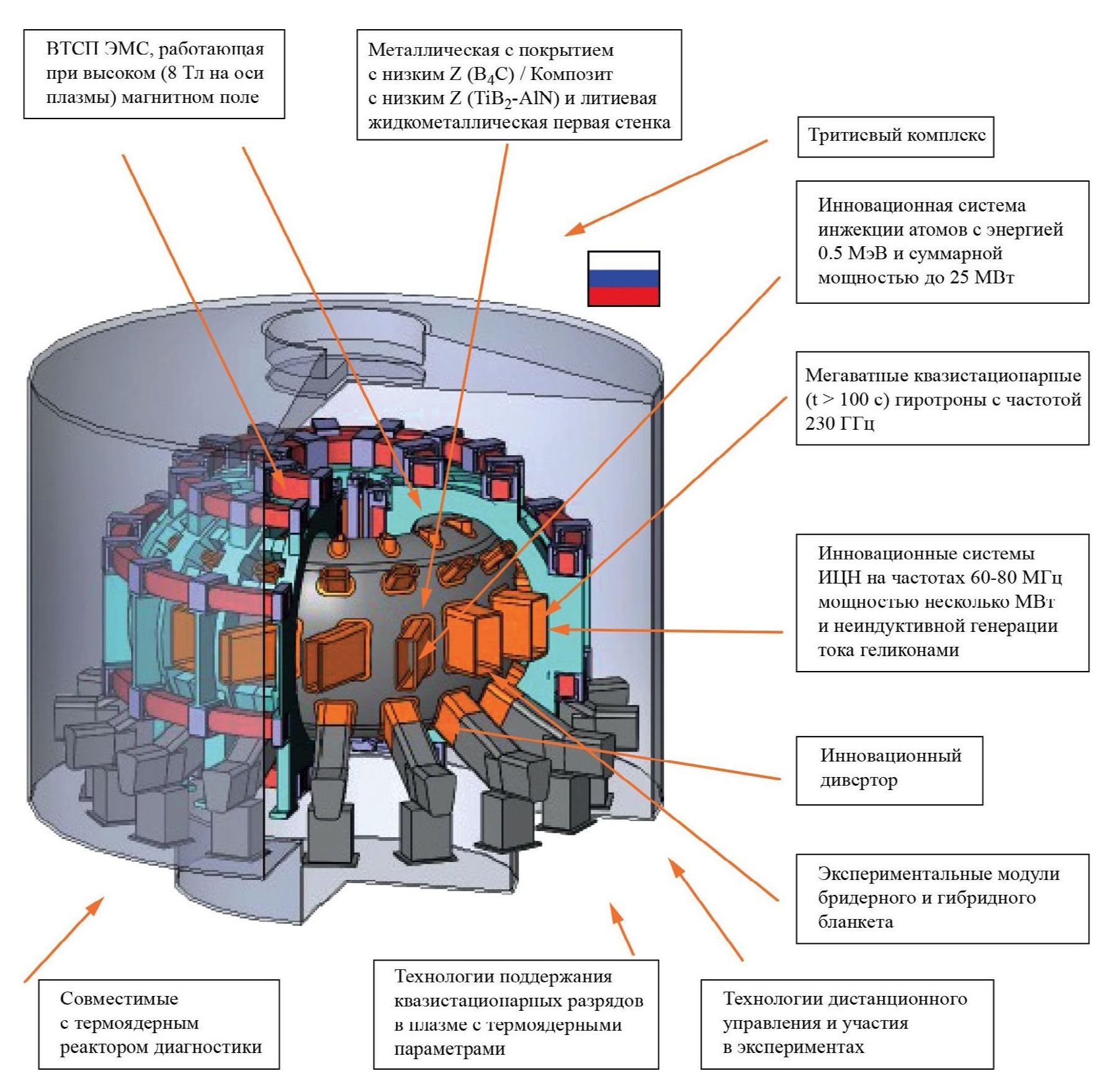 В рамках проекта ИТЭР на базе достижений развития токамаков в Советском Союзе, США (TFTR) и ЕС (JET), а также в Японии (JT-60U), Китае (EAST) и Республике Корея (K-STAR) создаётся технологическая платформа термоядерного реактора [1] и уже сегодня начинает формироваться мировая термоядерная промышленность. Технологическая платформа ИТЭР (см. рис. 1) включает электромагнитную систему (ЭМС) из низкотемпературных сверхпроводников (катушки тороидального поля (TFC) и центрального соленоида (CS) — из Nb3Sn, катушки полоидального поля (PFC) — из NbTi), первую стенку из Ве (в настоящее время также рассматривается вариант создания первой стенки из W + В покрытия (боронизация тлеющим разрядом и непосредственно в разряде ИТЭР с вводом крупинок бора)), W-дивертор c напуском Ne, криостат, крионасосы, криогенный комплекс, системы дополнительного нагрева и неиндуктивной генерацией тока, реакторосовместимые диагностики, системы сбора и дистанционной обработки данных, системы управления, экспериментальные модули бридерного бланкета и другие системы и технологии, уровень разработки которых и определяет современный мировой уровень технологического развития.