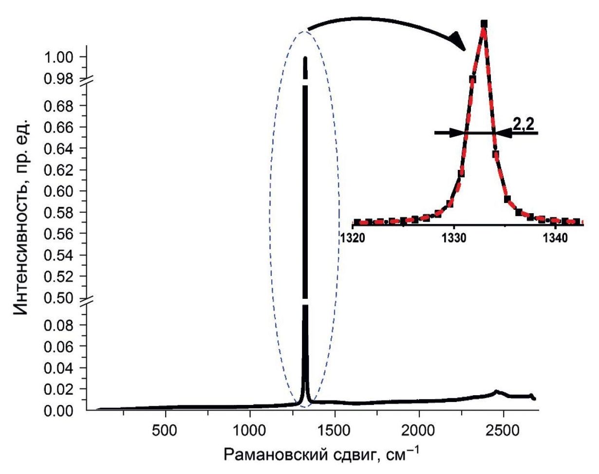 Ширина алмазной линии на половинной высоте является показателем неоднородных напряжений и дефектности кристалла, а ее положение зависит от напряжений, которые возникают в алмазной решетке. Наблюдаемое положение алмазной лини в области 1332.2 см−1 и значение полной ширины алмазной линии на половинной высоте (ПШПВ), которое составляет 2.2 см−1 (рис. 1), говорит о хорошем кристаллическом совершенстве алмазной структуры и об отсутствии сильных неоднородных напряжений.