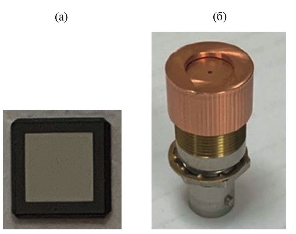 Рис. 3. Чувствительный алмазный элемент с нанесенными контактами (а). Детектор с чувствительным алмазным элементом в корпусе с прижимными контактами (б).