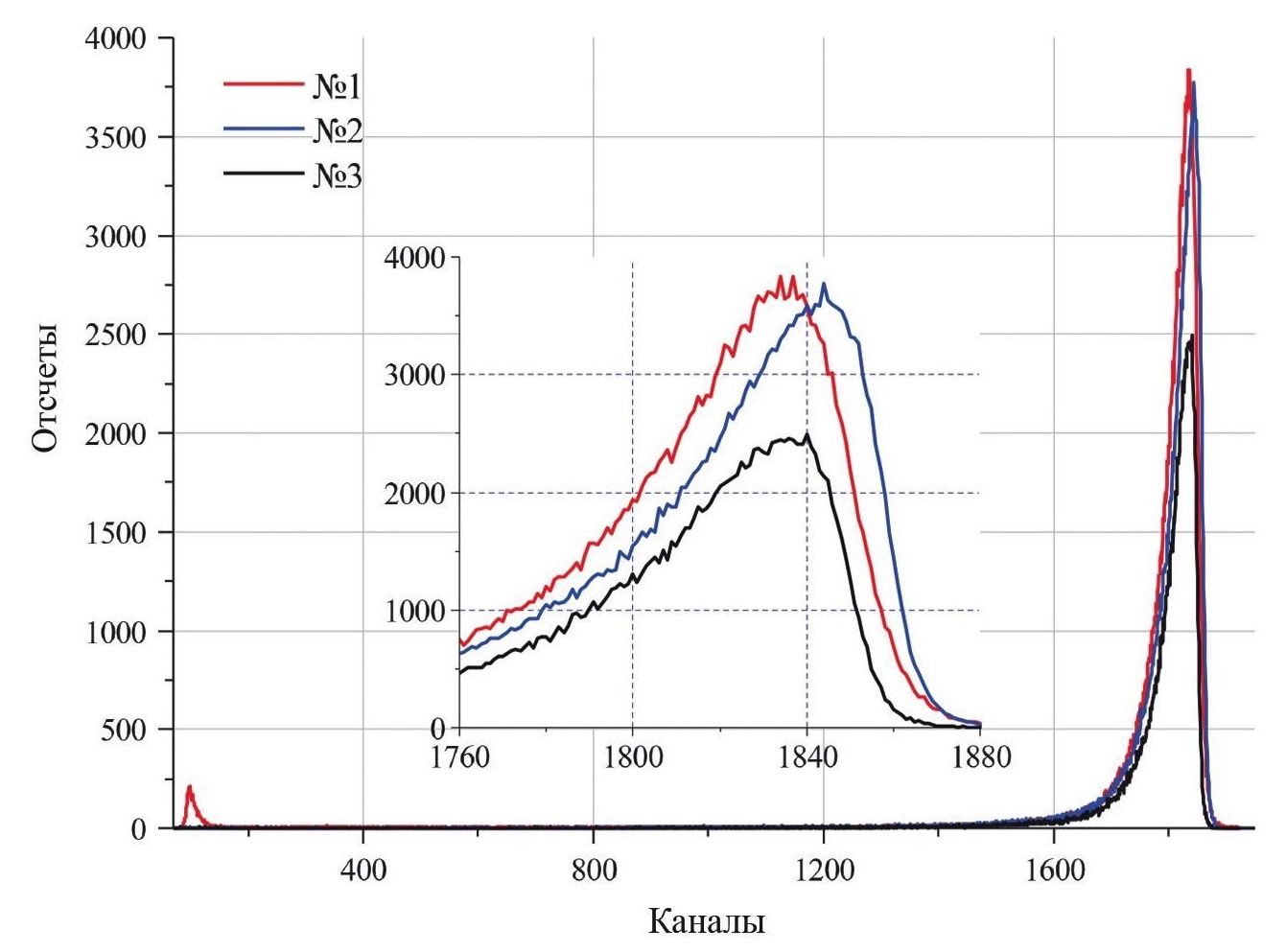 Рис. 4. Амплитудные спектры детекторов на образцах № 1 (красный), и № 2 (синий) и Е6 (№ 3, черный) при облучении альфа-частицами источника 241Am.
