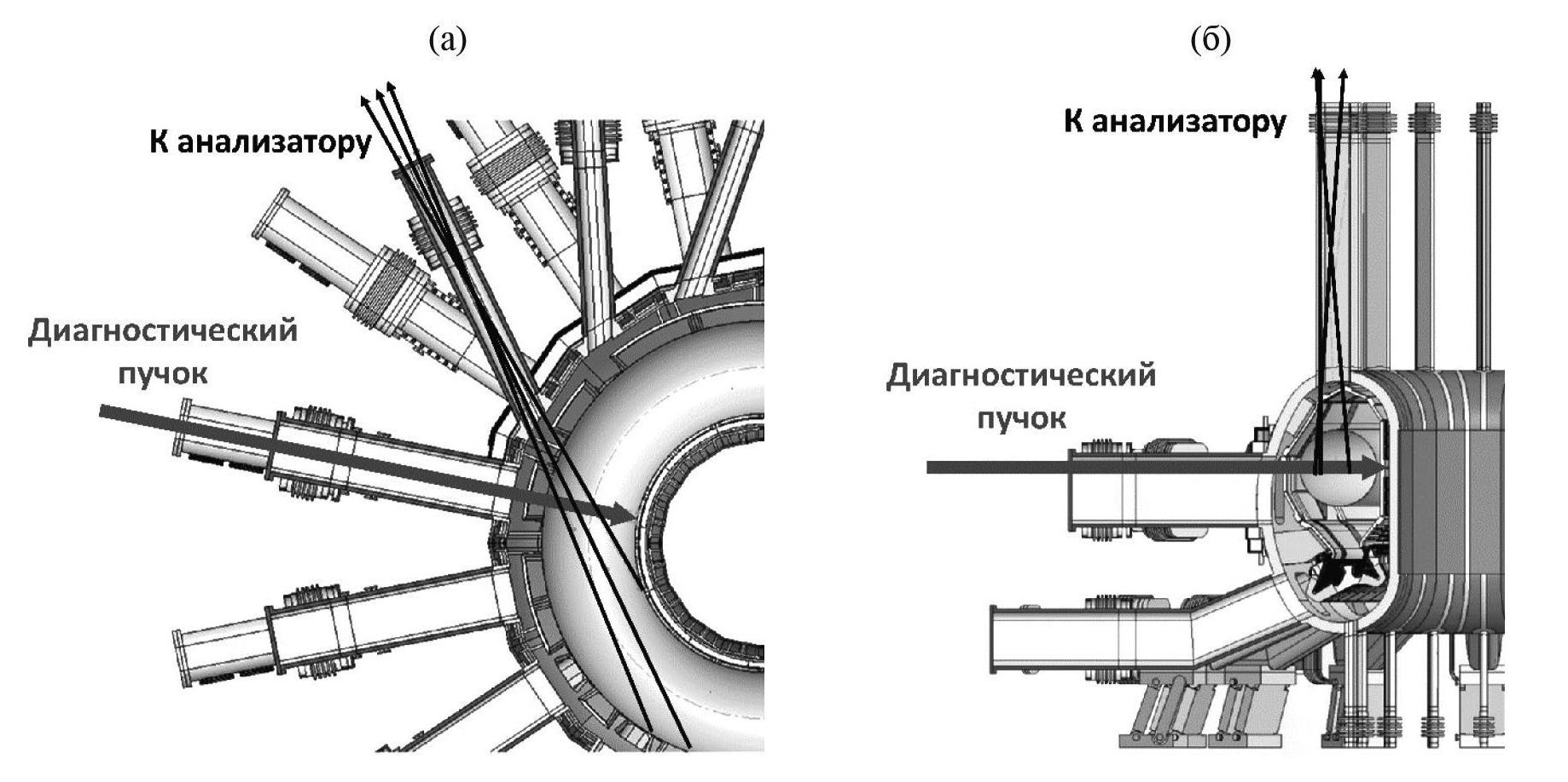 Рис. 1. Варианты взаимного расположения линии наблюдения анализатора атомов перезарядки и линии инжекции диагностического пучка на установке ТРТ: в экваториальной плоскости (а); в вертикальной плоскости (б).