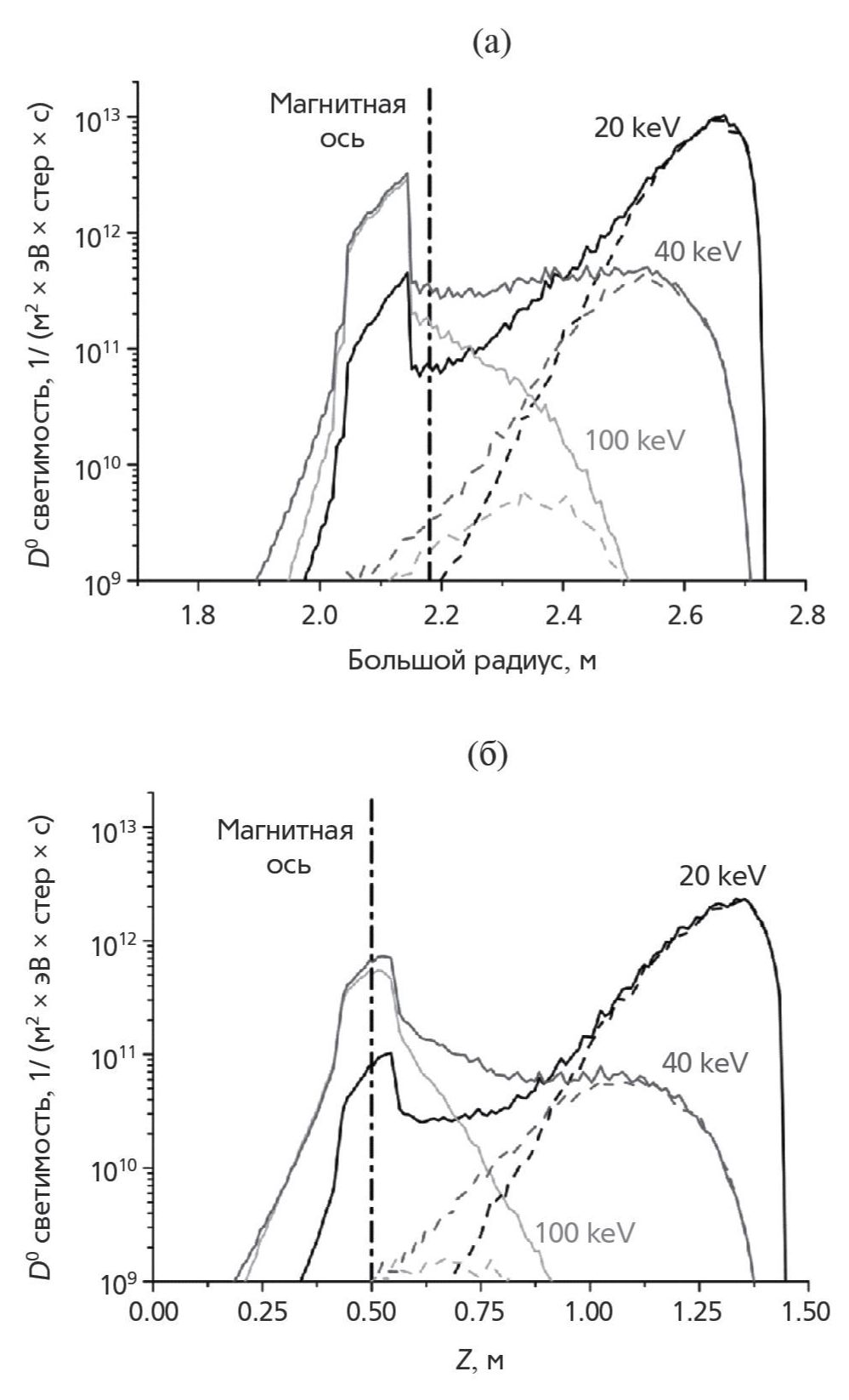Из представленных на рисунке данных видно, что пространственный профиль функции светимости меняется с изменением энергии вылетающих атомов. Для небольших энергий ~ 20 кэВ относительный вклад пучка в формирование потока нейтрализованных ионов плазмы незначителен. Это связано с двумя факторами. Во-первых, частицы таких энергий сильнее поглощаются при вылете из центральных областей плазмы, где происходит нейтрализация на пучке. Во-вторых, из-за достаточно высокой ионной температуры, на краю плазмы присутствует значительное количество тепловых ионов, перезарядка которых на атомах-донорах, поступающих со стенки, маскирует активный сигнал из центра. С ростом энергии влияние указанных факторов снижается и для энергий выше 40 кэВ перезарядка на пучке становится определяющей. Для обеих схем наблюдения, начиная с этой энергии, источник частиц достаточно хорошо локализован, позволяя проводить локальные измерения с пространственным разрешением ~14 см.