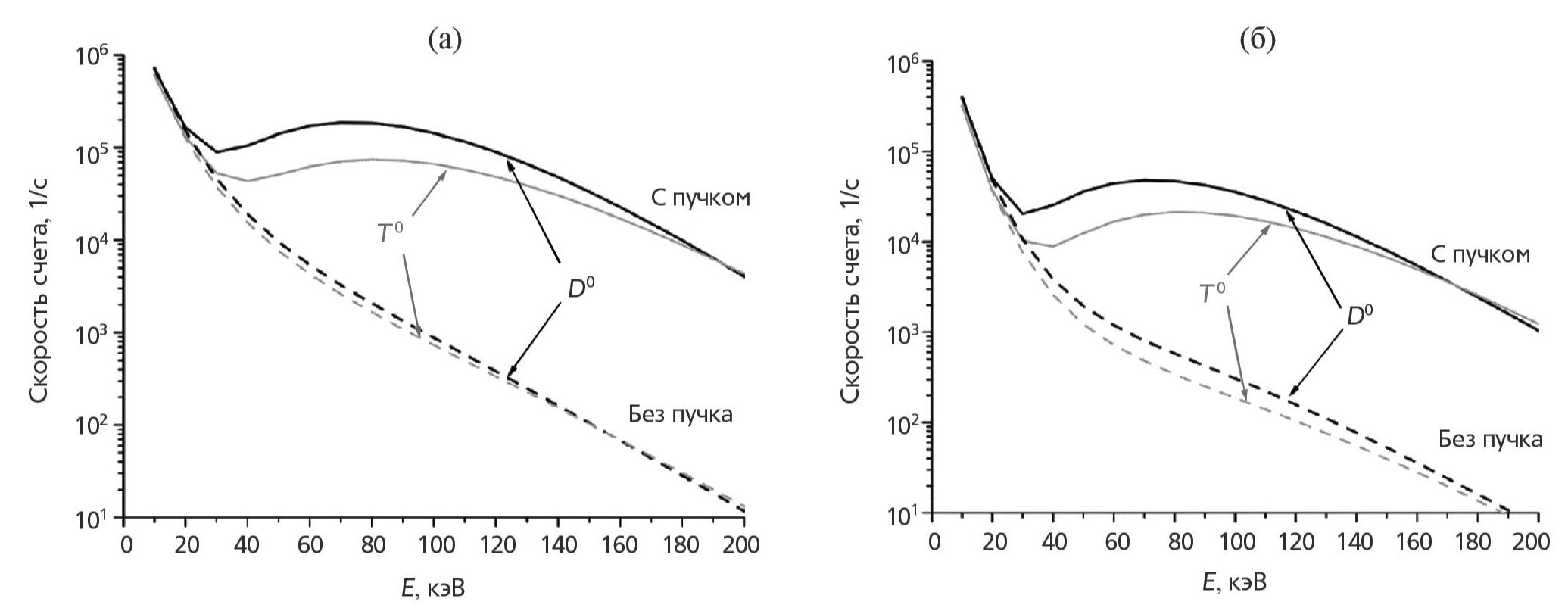 Сплошными линиями на рисунке обозначены скорости счета при инжекции пучка (активный сигнал), штриховыми линиями — при отсутствии пучка (пассивный сигнал). Как и ожидалось из анализа функций светимости, начиная с энергии 40 кэВ, активный сигнал оказывается значительно выше пассивного. Это позволяет легко отделить активную составляющую сигнала и упрощает последующий анализ данных. Следует отметить, что форма энергетической зависимости активного сигнала заметно отличается от квазимаксвелловской прямой линии, по наклону которой можно было бы напрямую судить о температуре ионов плазмы. Это происходит из-за существенного ослабления атомарных потоков при их выходе из центральной области плазмы. Частицы с большей энергией испытывают меньшее ослабление, поэтому, как видно из рис. 4, ближе к 200 кэВ энергетическая зависимость сигнала становится линейной. Чтобы использовать весь доступный энергетический диапазон для определения ионной температуры, а также изотопного соотношения плазмы, необходимо проводить численное моделирование активного сигнала. Это можно сделать, например, с помощью упомянутого выше кода DOUBLE-MC. В этом случае параметры плазмы определяются путем подгонки расчетного сигнала к измеренному, в результате варьирования ионной температуры и изотопного соотношения.