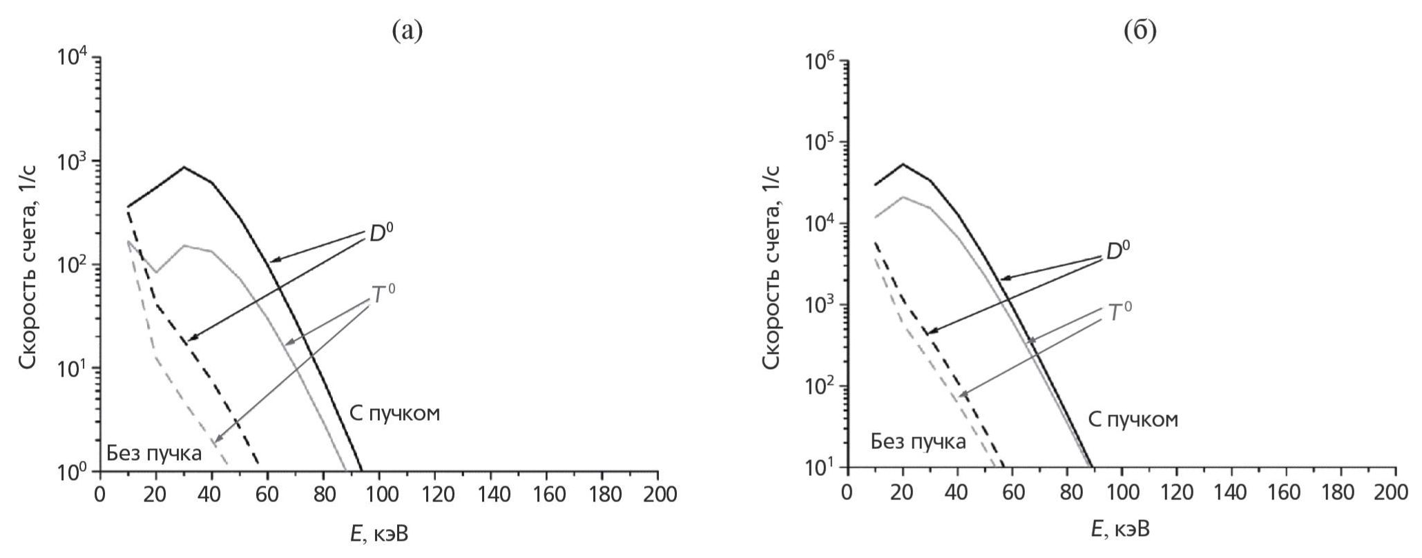 Рис. 5. Скорость счета атомов дейтерия и трития в детекторных каналах анализатора для вертикальной схемы наблюдения в разрядах ТРТ с уменьшенными параметрами: Te, i(0) = 5 кэВ, ⟨ne⟩ = 1 · 1014 см−3 (а); Te, i(0) = 5 кэВ, ⟨ne⟩ = 0.5 · 1014 см−3 (б).