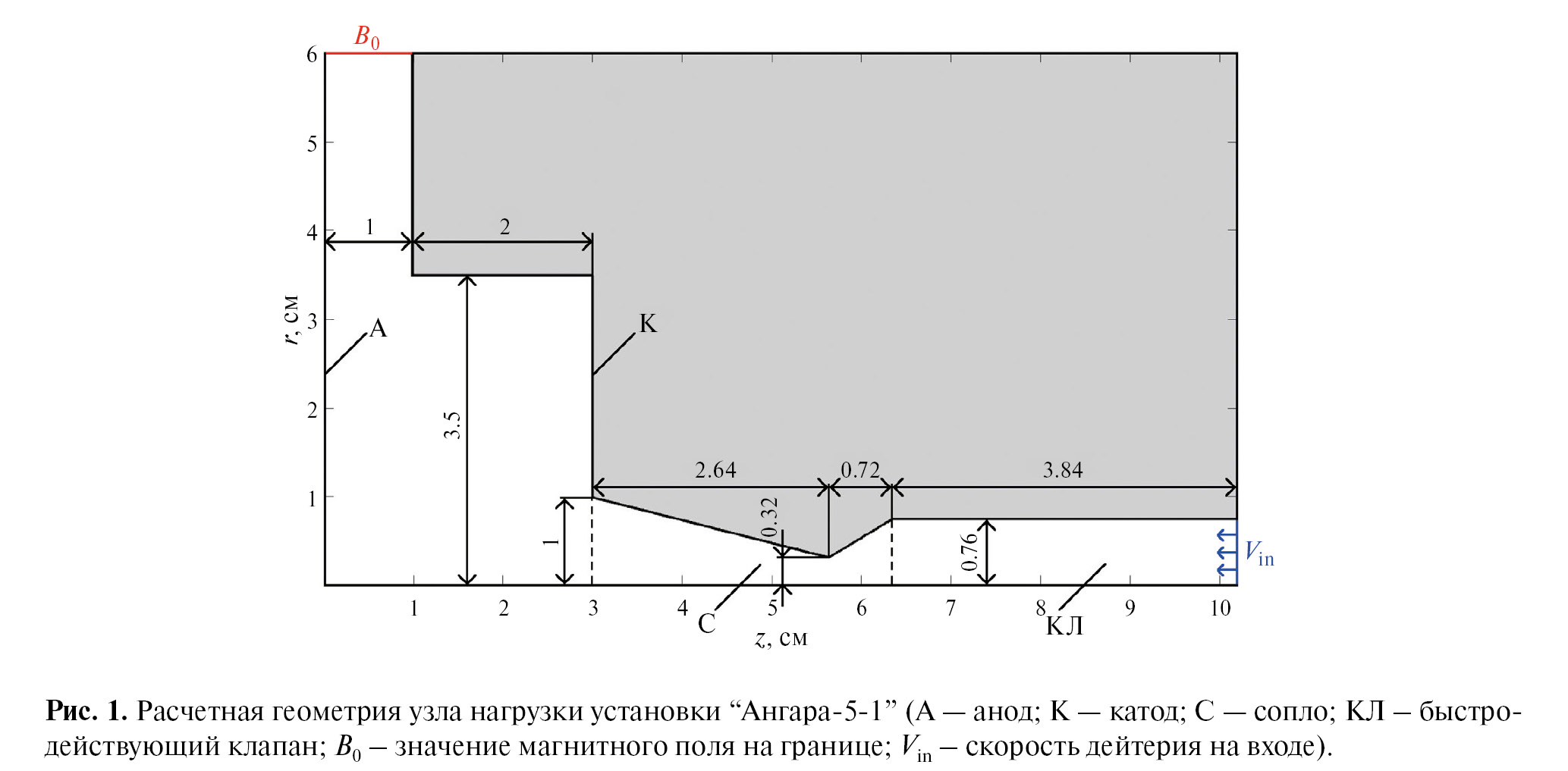 Область, выделенная белым цветом на рис. 1, имитирует внутреннюю, вакуумную область узла нагрузки установки “Ангара-5-1”, геометрия которого взята из статьи [6]. Отрезок А (z = 0) – анодный электрод, К — катодный электрод. Область С — сопло с выходным диаметром 2 см, предназначенное для напуска дейтерия в разрядный промежуток, область КЛ – быстродействующий дейтериевый клапан. В начальный момент времени в расчетах область заполнялась разреженным дейтерием с молярной массой А = 4 г/моль и фоновой “вакуумной” плотностью ρ vac = (2–8)∙10 –11 г/см 3, начальная температура газа T 0 = 300 К (0.0259 эВ).