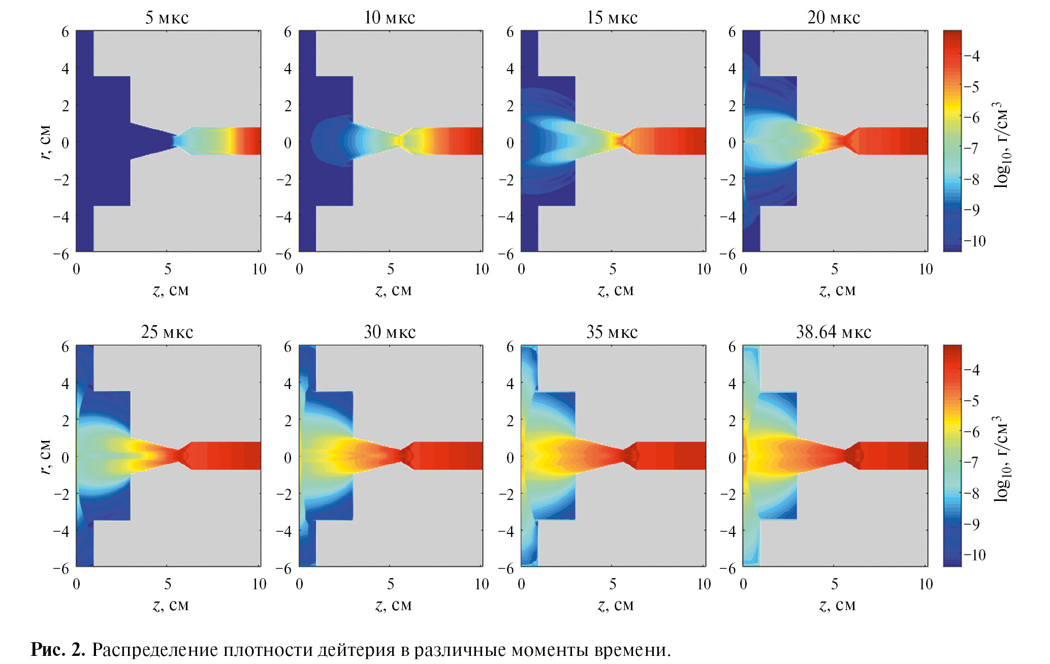 Рис. 2 показывает, что к 5 мкс дейтерий достигает узкой части сопла и в ней формируется струя, которая к 10 мкс достигает среза сопла и начинает заполнять разрядный промежуток между анодным и катодным электродами. К 15 мкс струя достигает анодного электрода и к 20 мкс начинает распространяться радиально от оси вдоль анода; при этом формируется отраженная от анода ударная волна, которая отчетливо видна, начиная с момента времени 25 мкс. Момент времени 38.64 мкс соответствует переходу к МГД-расчету.