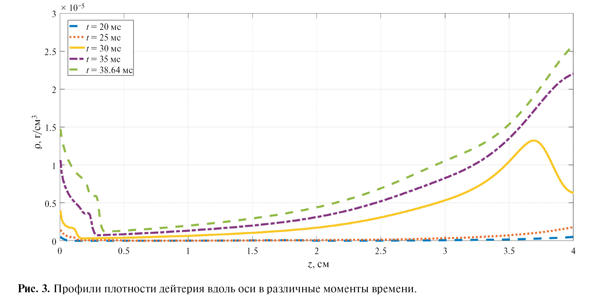 В целом из рис. 2 видно, что на приведенные моменты времени заполнение внутренней области узла нагрузки дейтерием является существенно неоднородным. Степень этой неоднородности демонстрирует также рис. 3, где приведены профили плотности дейтерия вдоль оси на участке 0 ≤ z ≤4 см, соответствующие моментам времени, для которых представлены распределения на рис. 2, начиная с 20 мкс.