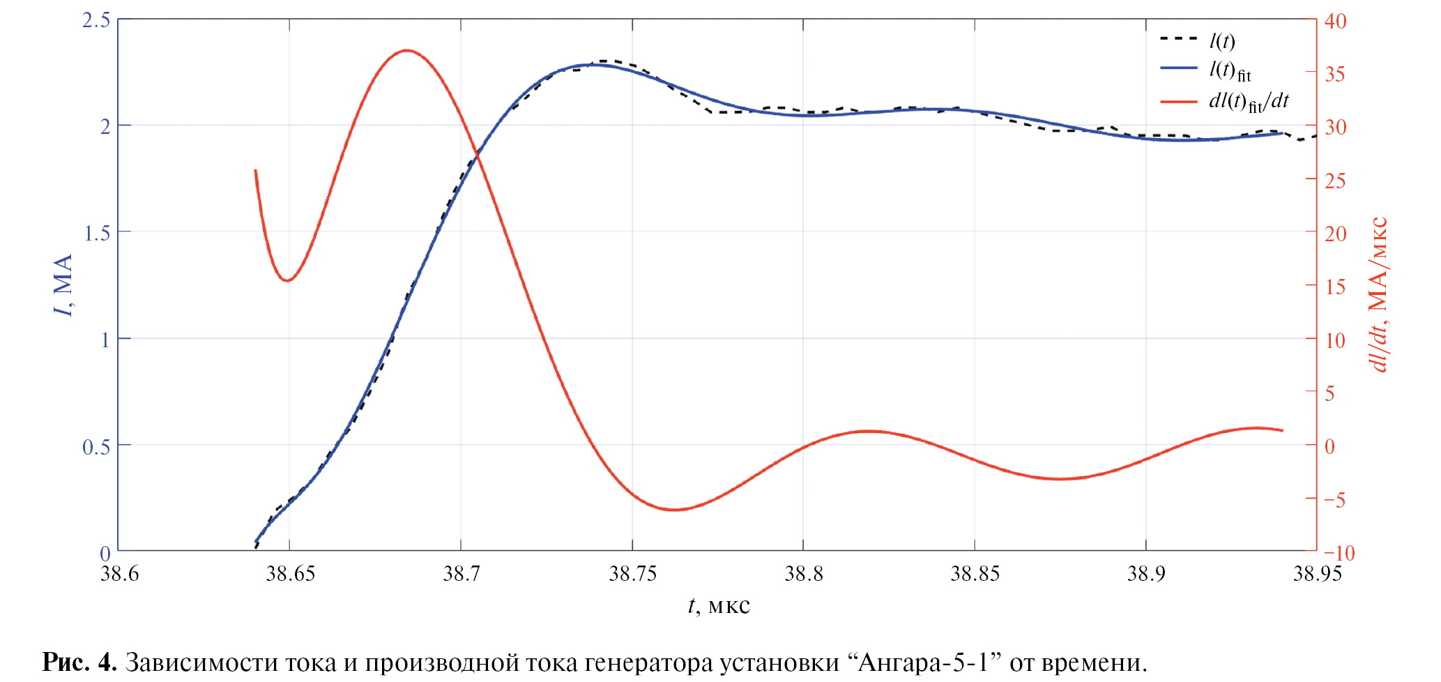 На рис. 4 представлена используемая в МГД-расчете зависимость тока генератора установки “Ангара-5-1” от времени I (t), взятая из статьи [6], а также ее аппроксимация полиномом 10-й степени I fit (t), и производная тока dI fit / dt, полученная путем дифференцирования по времени аппроксимирующего полинома I fit (t).