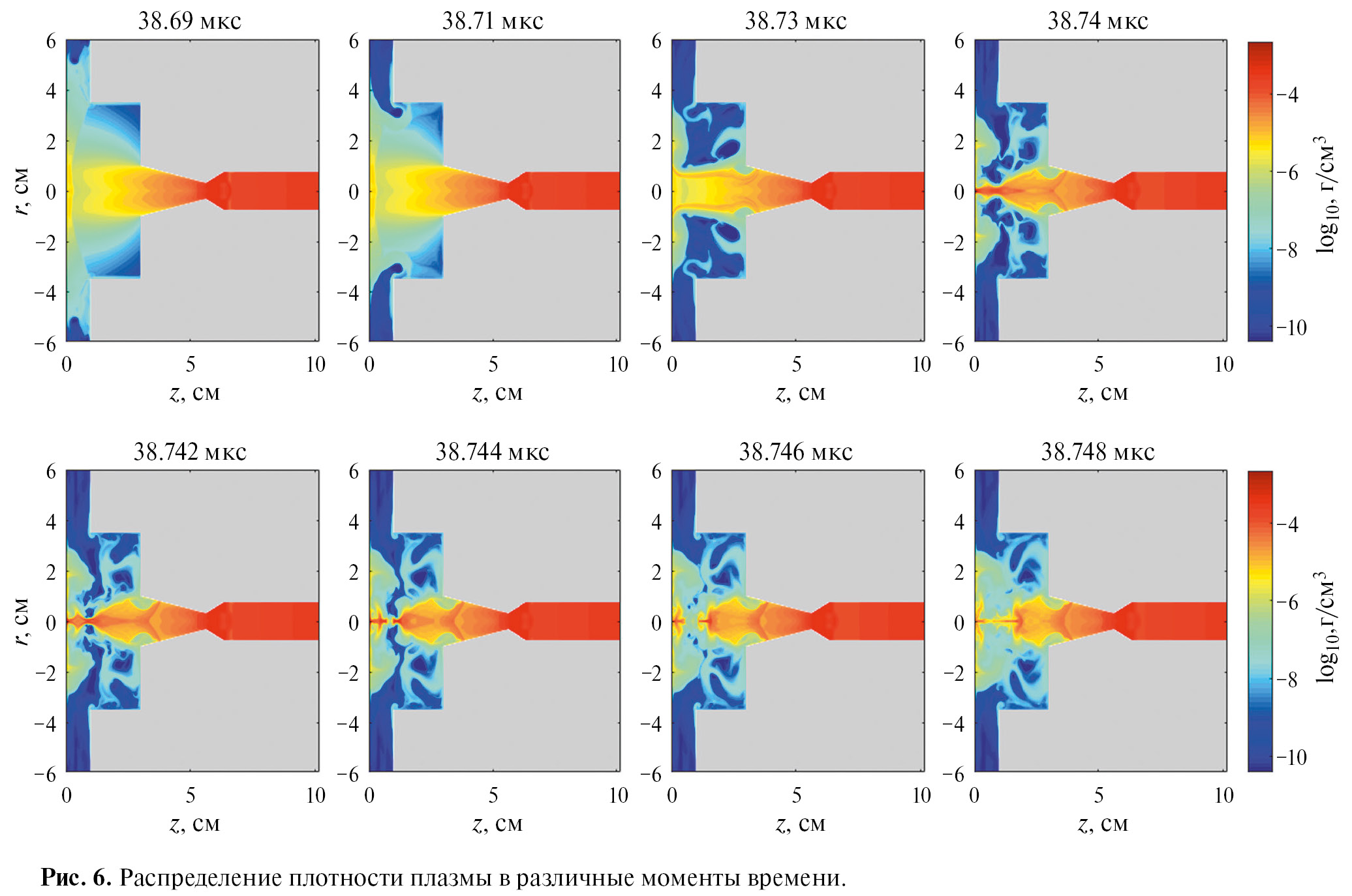 На рис. 6 приведено распределение плотности плазмы на различные моменты времени до и после образования пинча. Из распределений, представленных на рис. 6, видно, что с момента времени 38.69 мкс начинается сгребание магнитным полем дейтериевой плазмы в направлении оси системы. В момент времени 38.74 мкс на оси формируется сжимающаяся плазменная перетяжка – пинч, которая к моменту времени 38.742 мкс достигает диаметра 0.2 см и значения плотности 1.9∙10 –4 г/см 3, что в примерно в 18 раз превышает плотность плазмы на срезе сопла и в 160 раз превышает плотность плазмы у анода в момент перехода к МГД-расчету. В момент времени 38.744 мкс происходит разрушение плазменной перетяжки, а затем к моменту 38.748 мкс перетяжка замыкается вновь.