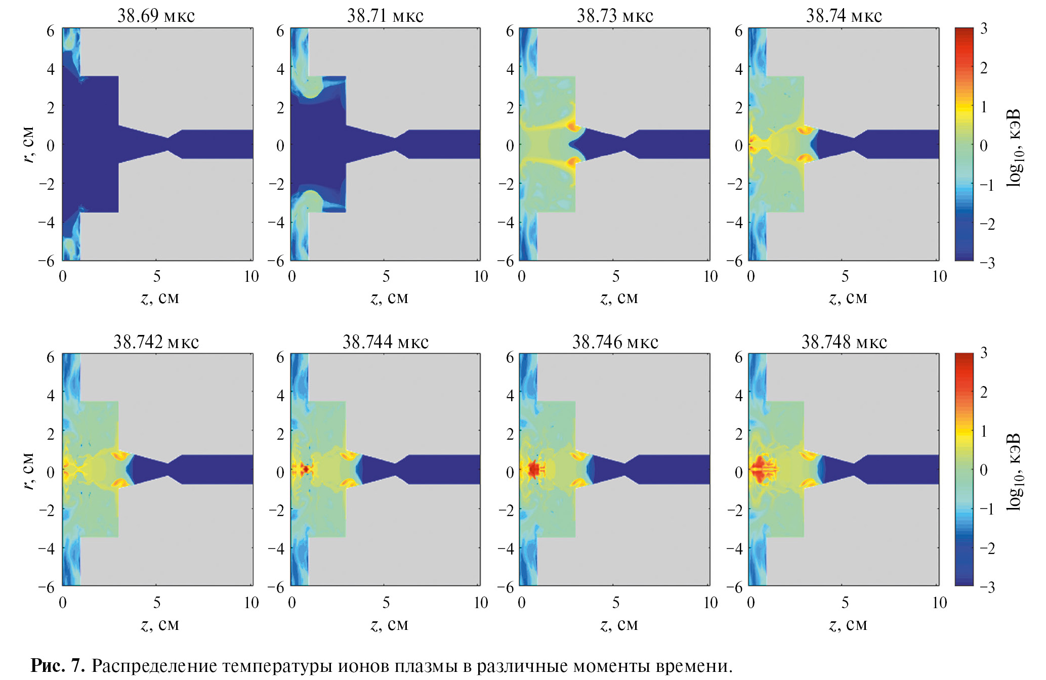На рис. 7 приведено распределение температуры ионов плазмы на различные моменты времени до и после образования пинча. Распределения температуры, представленные на рис. 7, показывают, что в расчетах присутствует значительный разогрев вакуумных областей позади плазменной оболочки, со значением температуры в диапазоне от 0.05 до 1 кэВ (значение 1 кэВ соответствует искусственно введенному в программу ограничению на температуру вакуума). Температура ионов в плазменной оболочке находится в диапазоне от 3 до 5 кэВ, а в момент образования перетяжки 38.74‒38.742 мкс возрастает до ~20 кэВ. В момент развала перетяжки температура ионов в образовавшемся зазоре превышает значение 1 МэВ.