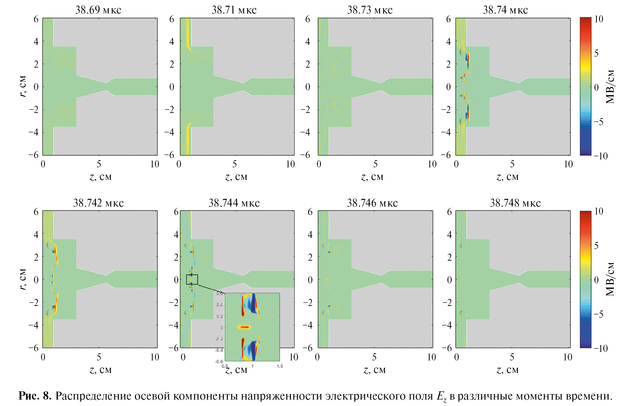 На рис. 8 приведено распределение осевой компоненты напряженности электрического поля E z на различные моменты времени до и после образования пинча. На рисунке в момент времени 38.744 мкс на врезке с увеличением показана область 0.5 ≤ z ≤ 1.5, 0 ≤ r ≤ 0.6, в которой происходит развал перетяжки и формирование зазора. В этой области на оси осевая компонента напряженности электрического поля E z достигает величины примерно 10 МВ/см, что при длине зазора порядка 2 мм может давать напряжение на зазоре до 2 МВ и, соответственно, энергию ускоренных в этом зазоре ионов до 2 МэВ. Эти ионы, согласно используемой нами модели ускорительного механизма [18, 30], вызывают генерацию нейтронов, взаимодействуя с ионами плазмы, которые в нашей модели мы считали покоящимися. На моменты 38.74‒38.744 мкс, в которые происходит сжатие и разрушение плазменной перетяжки, достигнутые в узком канале наибольшие значения E z порядка 10 МВ/см близки к результатам кинетического моделирования плазменного фокуса [17].