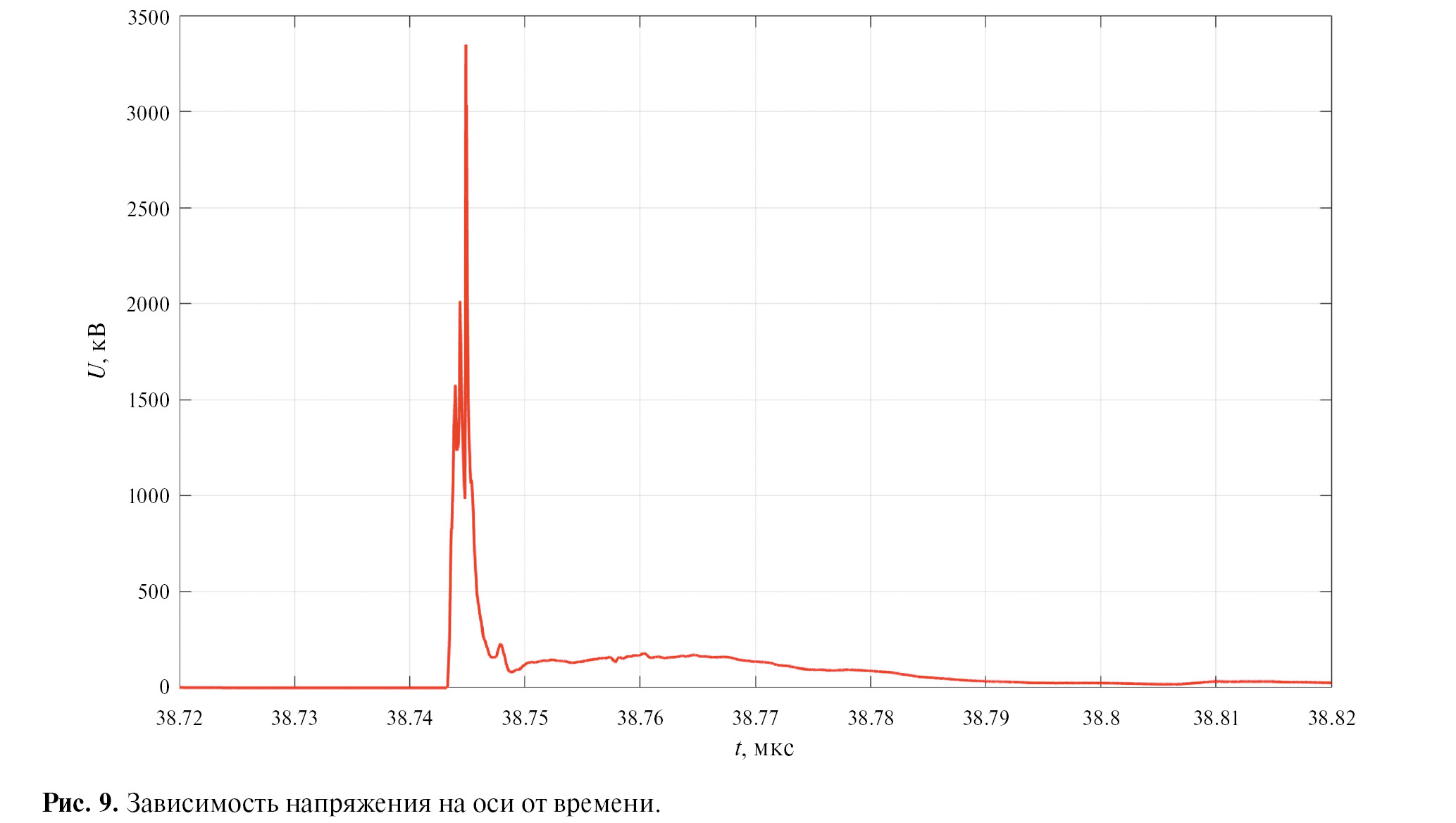На рис. 9 приведен полученный в МГД-расчете график зависимости напряжения на оси от времени. Из рисунка видно, что напряжение на оси достигает максимума 3.3 МВ в момент времени 38.745 мкс. Полуширина импульса напряжения составляет 1.1‒1.8 нс. Временной интервал 38.744‒38.748 мкс, на который приходится основной пик напряжения на оси, соответствует разрушению перетяжки (см. рис. 6). Замыкание перетяжки приводит далее к заметному снижению напряжения на оси.