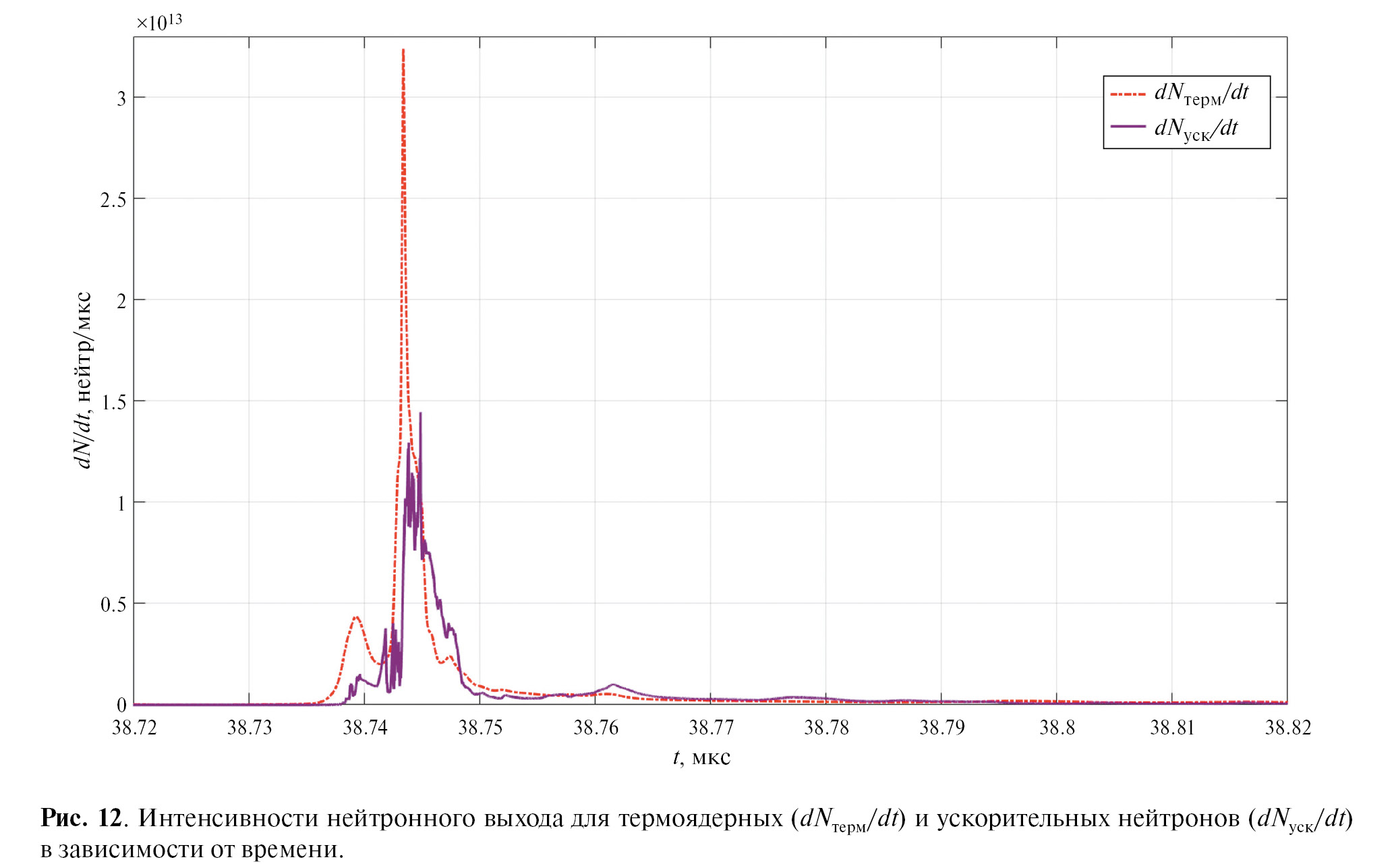 Интегральный выход нейтронов в расчете составил 1.5∙10 11 ДД-нейтронов за импульс, при этом на термоядерную составляющую нейтронного выхода приходилось 9∙10 10 ДД-нейтронов, а на ускорительную, соответственно, 6∙10 10 ДД-нейтронов. Такое соотношение термоядерных и ускорительных нейтронов существенно отличается от результатов расчетов нейтронного выхода в плазменном фокусе, где обычно ускорительных нейтронов в 100–1000 раз больше, чем термоядерных [18, 30].