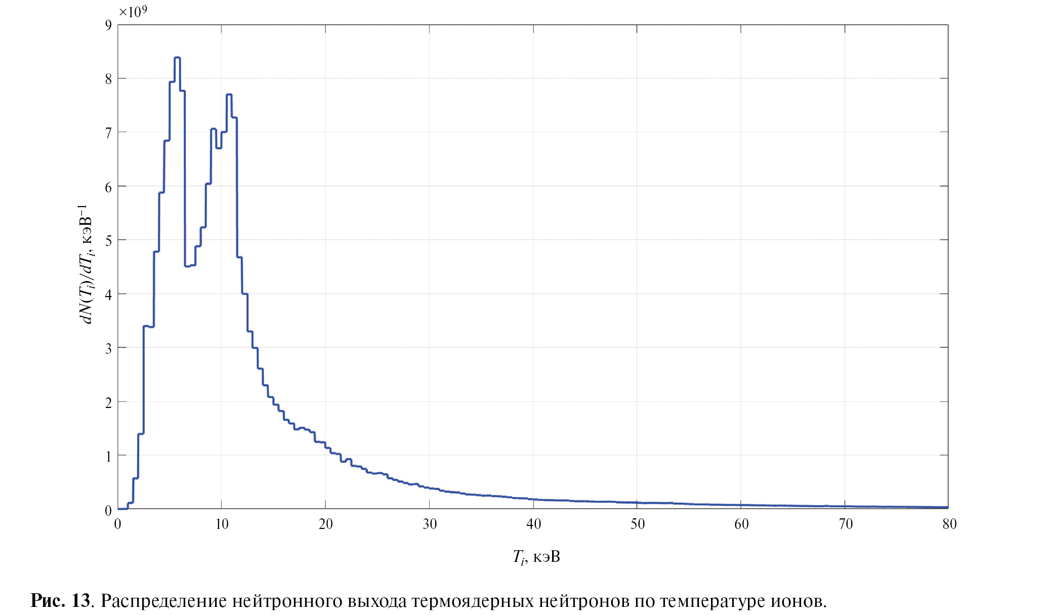 На рис. 13 представлено распределение нейтронного выхода термоядерных нейтронов по температуре ионов. Это распределение имеет два локальных максимума в области 5.8 кэВ и 10.8 кэВ, при этом 90% нейтронного выхода (от 5% до 95% от полного выхода) лежит в диапазоне температур 3–42 кэВ.