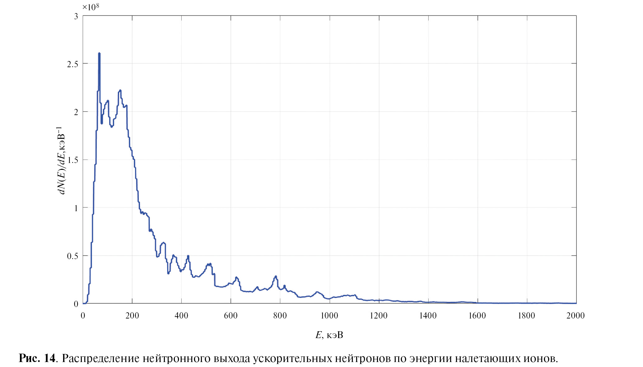 На рис. 14 представлено распределение нейтронного выхода ускорительных нейтронов по энергии налетающих ионов. Это распределение имеет основной пик в диапазоне энергий 40–300 кэВ и высокоэнергетический “хвост” 300–1200 кэВ. При этом 90% нейтронного выхода (от 5% до 95% от полного выхода) лежит в диапазоне 55–900 кэВ. Особенностью распределения выхода ускорительных нейтронов по энергии ионов пучка является его существенная немонотонность с большим количеством локальных минимумов и максимумов. Полученный в МГД-расчете диапазон энергий ускоренных ионов, приводящих к генерации ускорительных нейтронов, хотя и весьма широк, в целом согласуется с оценками, приведенными в [6], где данный диапазон энергий составляет 200–500 кэВ.