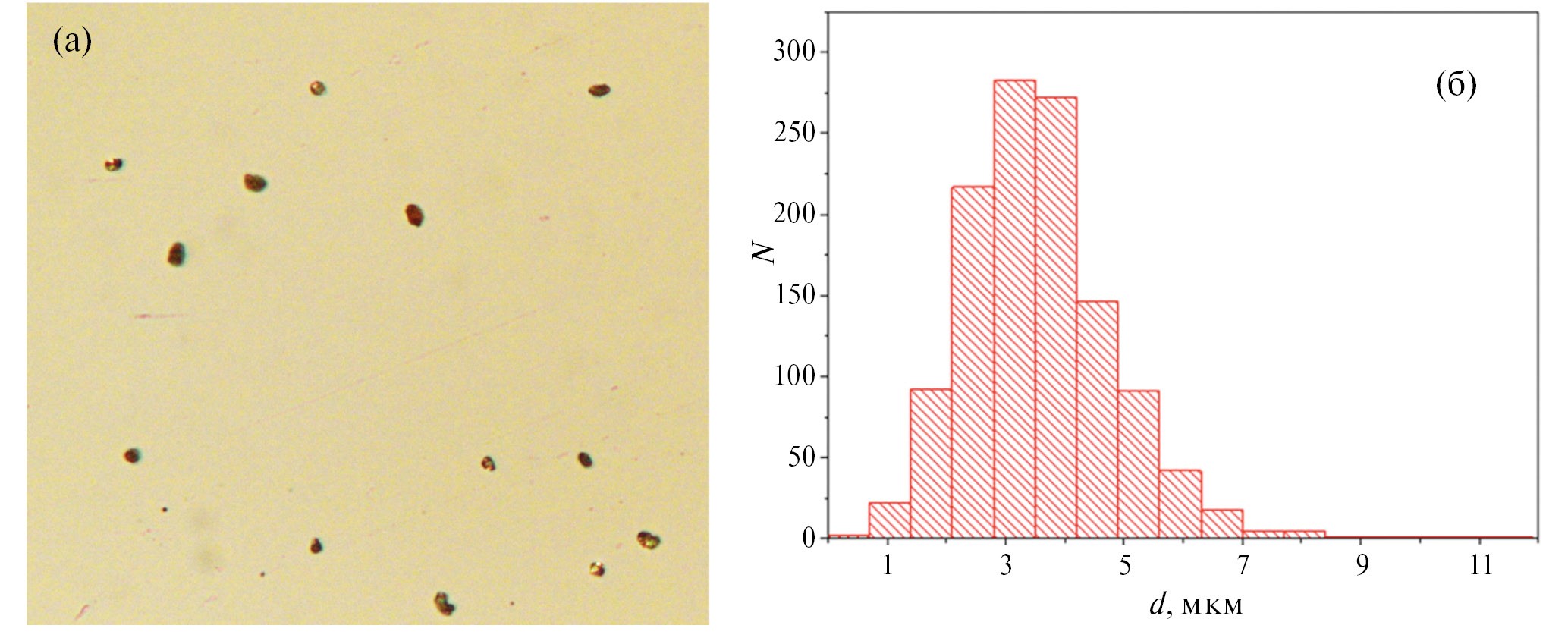 Рис. 3. а) Фото осажденн ых из ВЧИ - разряда пылевых частиц. Размер частиц – около 4 мкм. Ширина изображения – 200 мк. б) гистограмма распределения пылевых частиц по характерному размеру. Условия: газ неон, давление – 0.5 Торр, напряжение – 100 В, частота ВЧ-генерации – 40 МГц.
