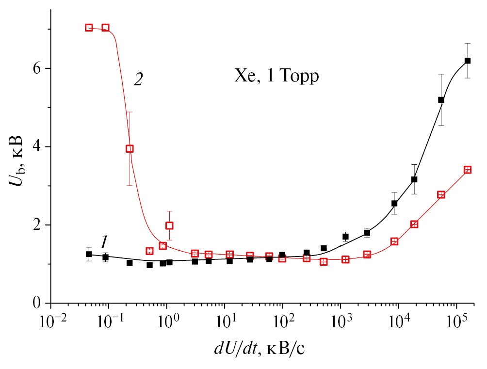 Освещение разрядной трубки излучением видимого диапазона может заметно влиять на характеристики пробоя в трубке – пробивное напряжение U b и время запаздывания пробоя (см. [1] и приведенные там ссылки). В недавних работах [2–4] обнаружено, что, в зависимости от скорости роста приложенного напряжения dU / dt, потенциал U b при освещении может меняться: как уменьшаться, так и увеличиваться. Первое реализуется при большой скорости роста напряжения, второе – при малой (рис. 1). Согласно [3, 4], исходной причиной в обоих случаях является вызванная освещением фотоэмиссия слабосвязанных электронов, адсорбированных на внутренней поверхности разрядной трубки. Эти электроны попадают под действие поля, существующего между стенкой и анодом. При быстром росте приложенного напряжения они с большой вероятностью оказываются в фазе сильного поля, что приводит к их размножению и формированию электронной лавины, инициирующей волну ионизации (ВИ) и последующее развитие пробоя. В результате уменьшается время запаздывания пробоя, что в условиях фронта импульса конечной длительности снижает пробивной потенциал. При медленном росте напряжения десорбированные электроны бóльшую часть времени находятся в фазе слабого поля, в котором ионизация невозможна. Однако, двигаясь в этом поле, они создают ток, заряжающий стенку области вблизи анода. Разность потенциалов между анодом и стенкой уменьшается, в результате чего для создания ВИ и пробоя требуется повышение анодного напряжения. В работе [3] это наблюдается в ксеноне, а в [4] еще и в неоне, аргоне и криптоне при низких давлениях (~1 Торр) и dU / dt ~ 10–100 В/с. Результаты этих работ привели к заключению, что напряжение пробоя при освещении трубки U b связано с напряжением пробоя без освещения U b 0 соотношением
