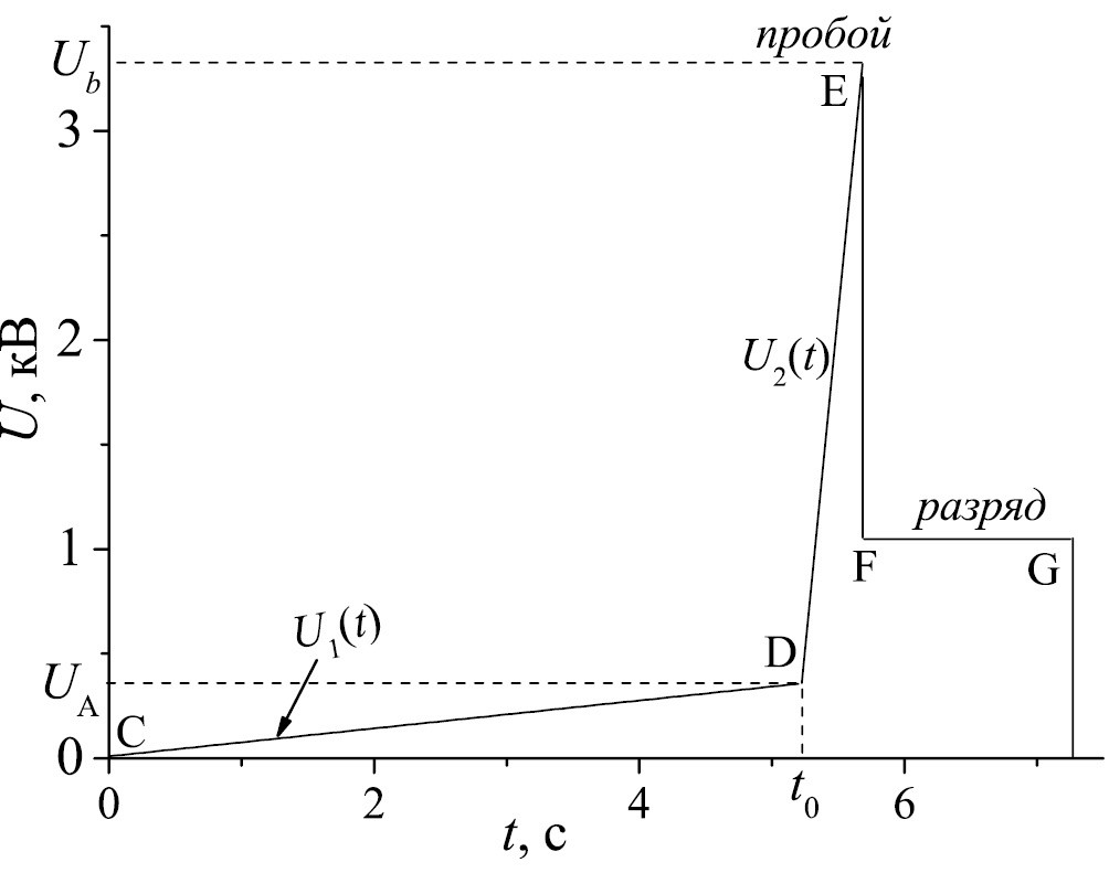 Измерения проводились на установке, описанной в работах [3, 4]. Использовались отпаянные разрядные трубки внутренним диаметром 8–13 мм и длиной 75–80 см. Трубки наполнялись инертным газом (Ne, Ar, Kr, Xe); исходная чистота газов была 99.99%, перед наполнением трубки проводилась их доочистка молекулярными ситами. К аноду трубки прикладывали линейно растущее напряжение U 1 (t) крутизной dU / dt = 40–50 В/с (прямая CD на рис. 2). При такой крутизне, согласно данным [3, 4], наблюдается сильное увеличение напряжения пробоя при освещении трубки. Потенциал U 1 (t), однако, обрывали раньше, чем происходил пробой, при некотором значении U A (точка D на рис. 2), но одновременно на анод подавали импульс длительностью 10 мс и фронтом U 2 (t) большой крутизны – 7×10 5 В/с (прямая DE). Этот импульс уже приводил к пробою, причем фронт такой крутизны обеспечивает наименьшее напряжение пробоя U b = U b m (минимум на кривой зависимости U b от dU / dt [3, 4], рис. 1). Кроме того, при такой величине dU / dt влияние освещения трубки на потенциал пробоя тоже минимально, или отсутствует совсем [3, 4], т.е. U b m = U b 0. Потенциал U 2 возрастал до тех пор, пока не происходил пробой (точка E), из-за чего напряжение падало до уровня FG – напряжения горения разряда. Эта процедура, таким образом, позволяла измерить напряжение пробоя в условиях, когда стенка предварительно заряжена одновременным воздействием освещения и анодного напряжения U A.