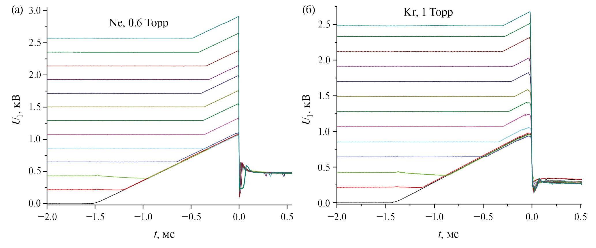 С другой стороны, очевидно, что процесс зарядки стенки занимает какое-то конечное время. Для оценки этого времени был проведен следующий эксперимент. Линейно растущее анодное напряжение начиналось не с нулевого, а некоторого конечного значения U 0. На рис. 7 показаны осциллограммы этого напряжения с различными U 0 для пробоя в аргоне. Для других газов картина аналогична. Точка t = 0 («аппаратный нуль») отвечает моменту запуска схемы формирования линейного напряжения. Осциллограммы с U 0 > 0 сдвинуты по горизонтали таким образом, чтобы совместить моменты пробоя. При этом оказывается, как видно из рисунка, что напряжение пробоя для всех значений U 0 одинаковое, несмотря на то, что длительность процесса зарядки стенки до момента, когда U = U b 0, для них разная. Это опять согласуется с тем, что зарядка происходит тогда, когда анодное напряжение достигает значения, близкого к U b 0. Отметим, что для всех приведенных осциллограмм U 0 < U b 0. Рис унки 8а,б показывают область, где U 0 ≈ U b 0, более детально. На обоих графиках две первые осциллограммы смещены для наглядности вверх. Для них, аналогично рис. 7, U 0 < U b 0. Их верхние, почти горизонтальные, отрезки есть, очевидно, начальные участки наклонных прямых рис. 7. Таким образом, они соответствуют ситуации, когда стенка заряжается и поэтому пробой при U = U b 0 не происходит. Две другие осциллограммы соответствуют обратному неравенству, U 0 > U b 0, в этом случае стенка в момент скачка потенциала не заряжена, и тогда пробой происходит на его переднем фронте. Короткий зашумленный отрезок отвечает протеканию разрядного тока (длительность разрядного импульса 10 мс). Переход от одной картины к другой происходит за время, не превышающее 0.1 с. Таким образом, этого интервала достаточно, чтобы стенка зарядилась до потенциала, при котором пробой при U = U b 0 произойти не может.
