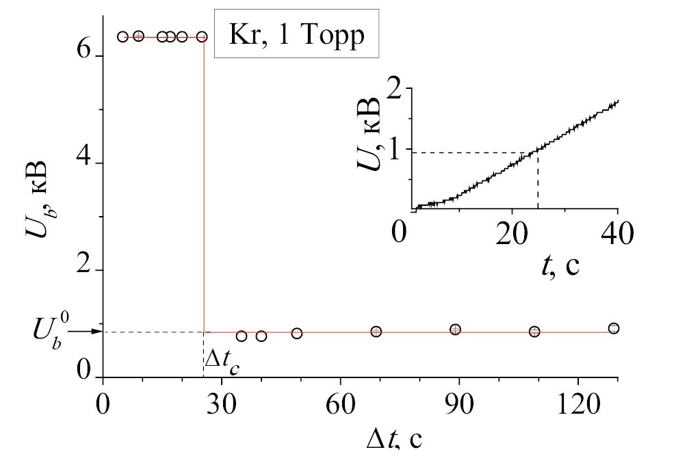 Это подтверждают дополнительные эксперименты, результаты которых представлены на рис. 5 и 6. Они иллюстрируют влияние на напряжение пробоя импульсного освещения. На первом из них световой импульс варьируемой длительности τ начинается в момент начала роста анодного напряжения. Видно, что U b остается неизменным и близким к U b 0 вплоть до значения τ = τ с ≈ 13 с. Осциллограмма анодного напряжения U (t), изображенная на врезке, показывает, что при t = τ с напряжение становится равным или близким к U b 0. И только с этого момента начинается рост пробивного напряжения. П рименительно к концепции зарядки стенки это означает, что при U (t) < U b 0 зарядка не происходит, несмотря на наличие освещения и электрического поля между анодом и стенкой. На рис. 6 варьируется запаздывание Δ t переднего фронта светового импульса по отношению к началу роста анодного напряжения. Импульс заканчивается значительно позже, уже после того, как произошел пробой. Видно, что пробивное напряжение значительно превышает U b 0 во всем интервале изменения Δ t и падает до U b 0 при значении Δ t > Δ t с ≈ 25 с. Осциллограмма анодного напряжения на врезке показывает, что при t = Δ t с значение U (t) ≈ U b 0. Таким образом, если световой импульс начинается позднее, чем анодное напряжение достигло U b 0 – пробивного значения в отсутствие освещения, то пробой произойдет именно при U b 0, и освещение не играет роли. Такой результат кажется вполне очевидным безотносительно к механизму влияния облучения. Интереснее другая закономерность – то, что U b остается постоянным на всем промежутке Δ t от 0 до Δ t с. Другими словами, воздействие освещения не зависит от длительности такого воздействия. Это, как и в предыдущем случае, согласуется с предположением о том, что зарядка стенки происходит в самом конце светового импульса, когда анодное напряжение достигает значения, близкого к U b 0. При меньшем напряжении зарядка не происходит, несмотря на наличие освещения и электрического поля между анодом и стенкой.