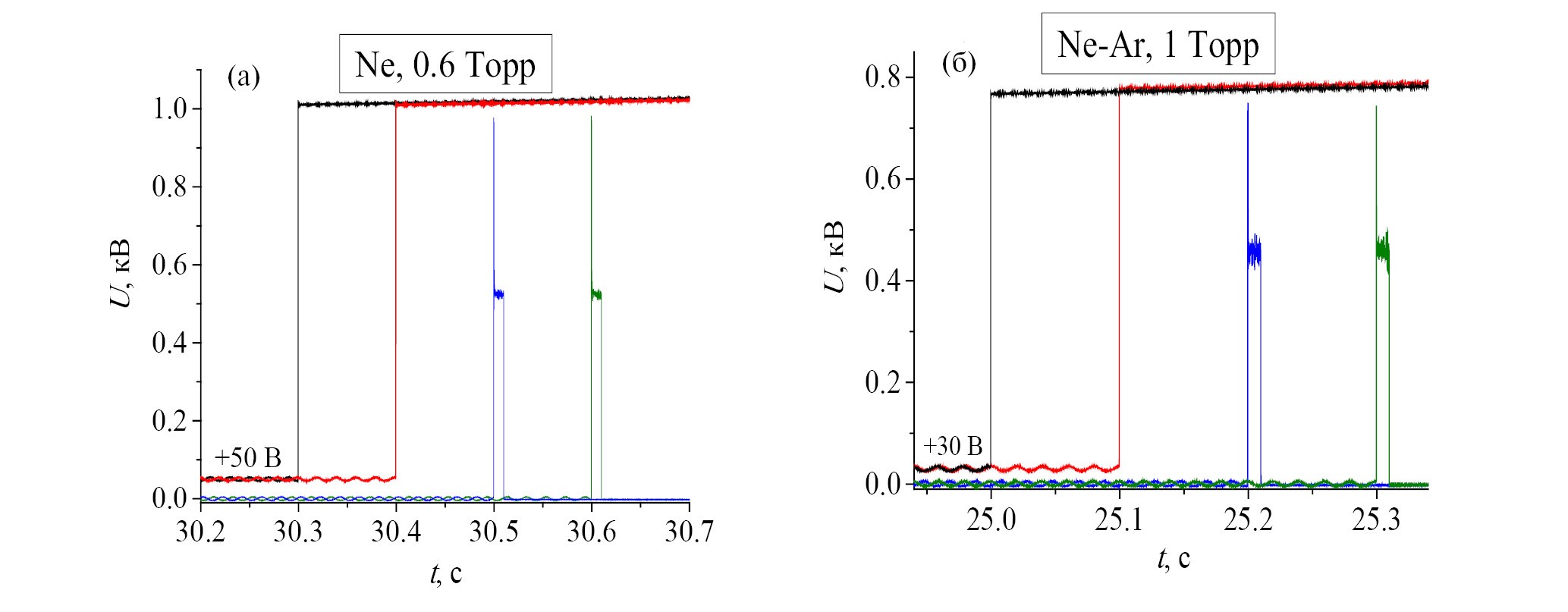 На рис. 3 представлены осциллограммы анодного напряжения для двух газов – неона и криптона. Регистрировался короткий промежуток времени вблизи момента пробоя. На таком промежутке отрезок осциллограммы, отвечающий наклонной прямой CD рисунка 2, выглядит горизонтальным. Самая нижняя траектория соответствует случаю, когда напряжени е U 1 (t) отсутствовало, то есть при U А = 0. Остальные осциллограммы отвечают разной задержке t 0 импульса U 2 относительно начала роста U 1 (t), о т 5 до 60 с, что соответствует значениям U А ≈ 200 ÷ ÷ 2500 В. Видно, что потенциал U 1 влияет на напряжение пробоя, но только если U А превышает некоторое критическое значение ; последнее близко к потенциалу пробоя без освещения U b 0 [4]. При меньших U А наличие потенциала U 1 не меняет потенциал пробоя или меняет незначительно.