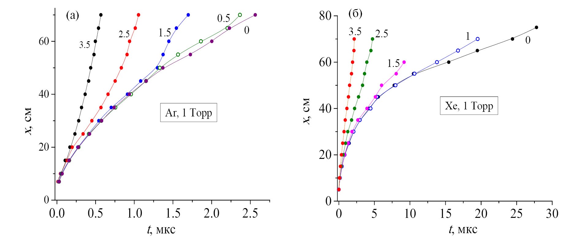 На рис. 11 представлены результаты обработки данных рисунков 10 и подобных графиков – зависимость длины пробега ВИ от времени (xt - диаграммы) для различных значений U. Обращает на себя внимание то, что эти кривые заметно меняются только начиная с достаточно больших значений U, а именно с таких, которые близки к потенциалу U b 0. Причина искажения xt -диаграмм при подаче потенциала на анод может быть объяснена следующим. Здесь, в отличие от предыдущего случая, от катода движется отрицательная ВИ, и, оказываясь в области положительно заряженной стенки, она усиливается и ускоряется. Эффект проявляется тем сильнее, чем выше потенциал анода, так как при этом увеличивается заряд стенки. А тот факт, что это наблюдается только для U > U b 0, подтверждает, что при более низком анодном потенциале зарядки стенки не происходит.
