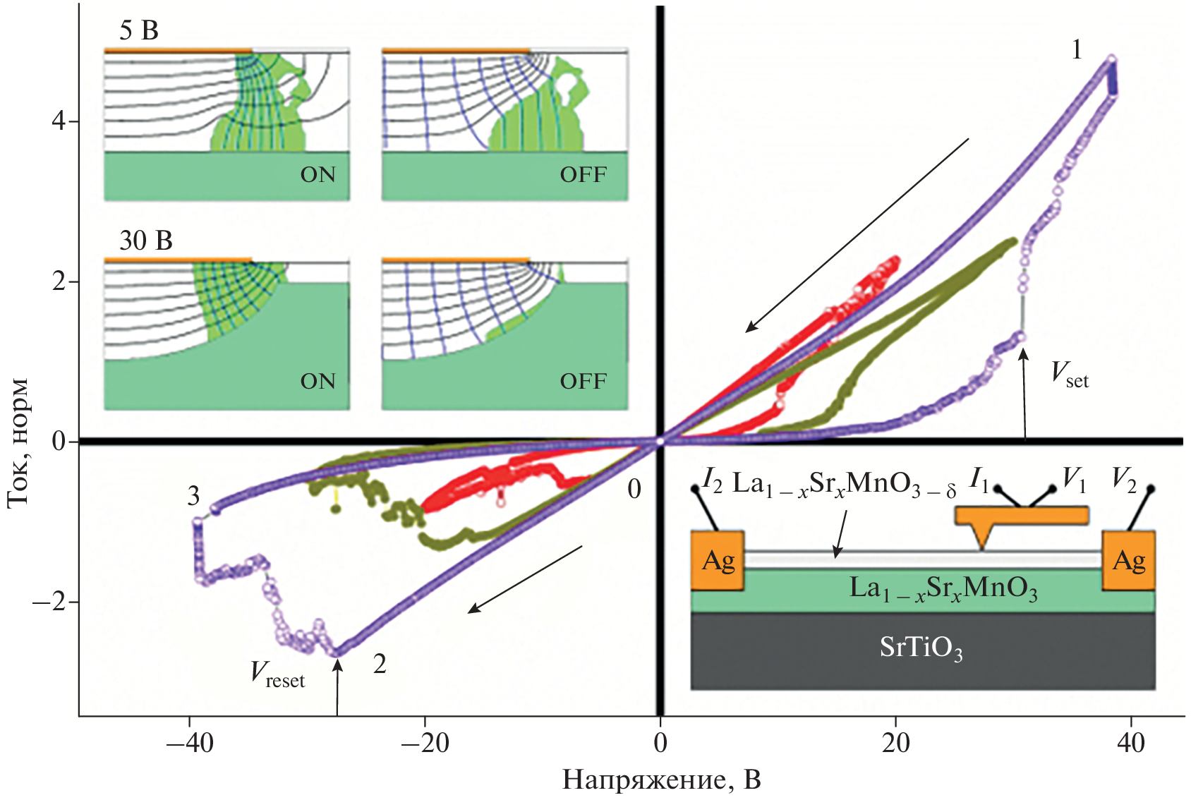 The choice of base materials and the use of their functional properties in the development of the structure and elucidation of the mechanism of resistive switching has been analyzed. Mesoscopic heterostructures based on epitaxial oriented 〈001〉 films of high-temperature superconductor YBa2Cu3O7 – δ and doped manganite La1 – xSrxMnO3 – δ, were obtained, and the properties of percolation channels of structures based on these compounds were studied. The effects of “self-adapting electroforming” in microcontact heterostructures based on epitaxial films of manganite are observed. Numerical calculations using the critical electric field model have shown that “self-electroforming” occurs in strong electric fields and a gap structure is formed in the contact zone. This structure provides reproducibility of resistive switching.