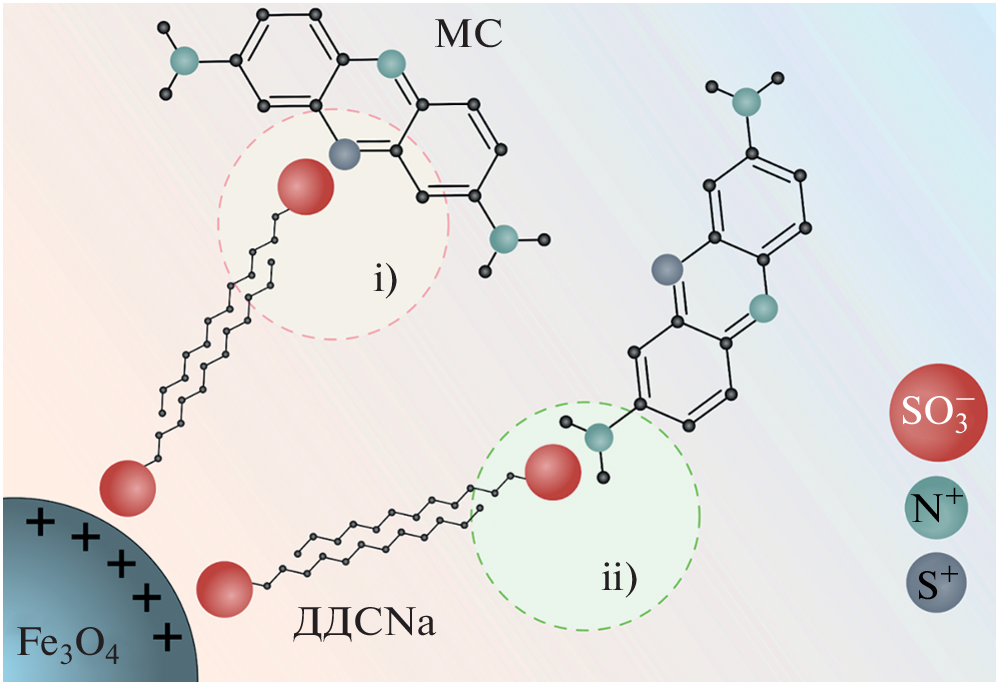 We show that surface-modified magnetic iron oxide nanoparticles with an average size of about 10 nm have a high adsorption capacity for sorption of pollutants from wastewater. A significant advantage of using magnetic materials is the ability to extract the sorbent using an external magnetic field, which makes the purification process more efficient. We found that the anionic substance sodium dodecyl sulfate increases the electrostatic attraction to the cationic compound methylene blue, and also prevents the aggregation of nanoparticles, thus increasing the active surface. The sorption capacity of magnetic nanoparticles after surface functionalization increased by a factor of 250 compared to unmodified iron oxide nanoparticles. The mechanism and kinetic parameters of the sorption process were determined, as well as the optimal conditions for increasing the efficiency of the sorption process.