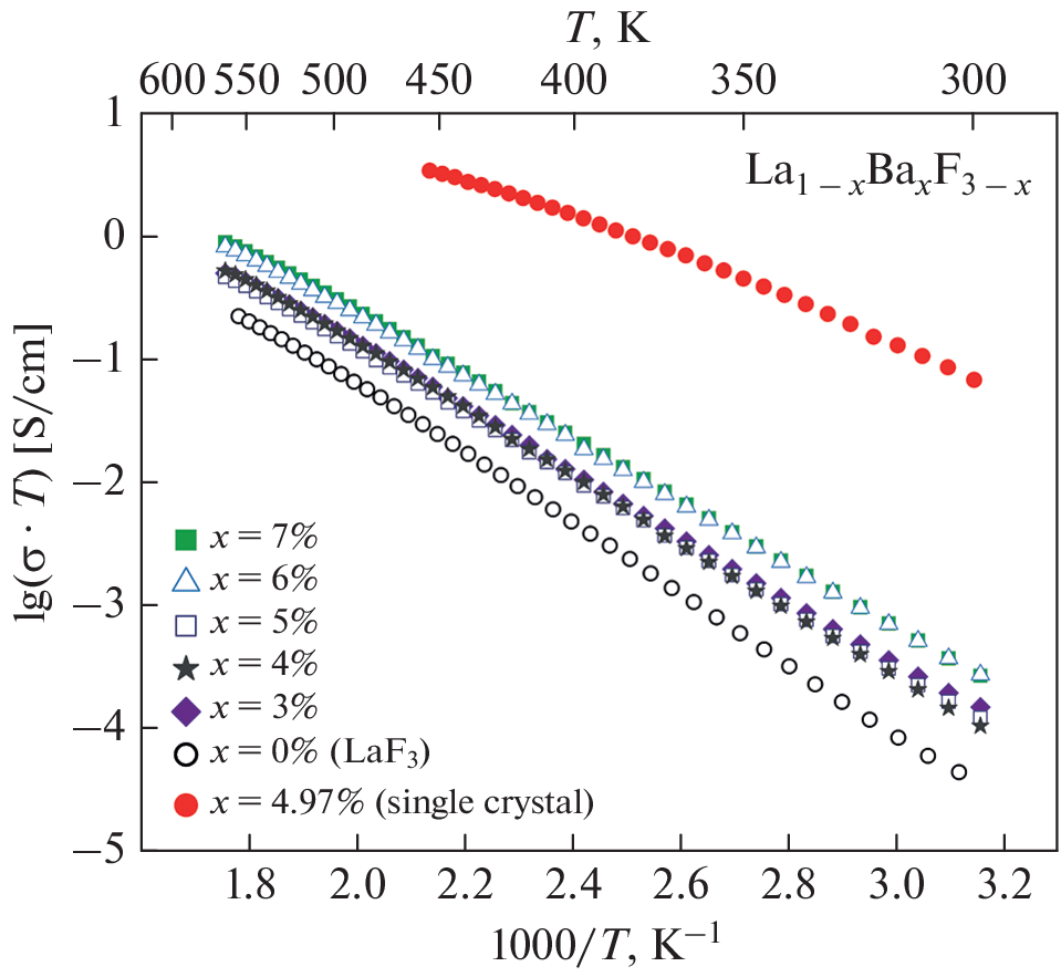 Nanopowders of tysonite solid solutions La1 – xBaxF3 – x (х = 0–0.07) were synthesized for the first time by thermal decomposition of lanthanum and barium trifluoroacetates. The samples obtained were characterized by electron microscopy, X-ray phase analysis, and impedance spectroscopy. Nanoparticles are crystalline and have characteristic sizes of 20–75 nm. The ionic conductivity of solid solutions in the range up to 300°C is determined by surface phenomena at the particle boundaries.