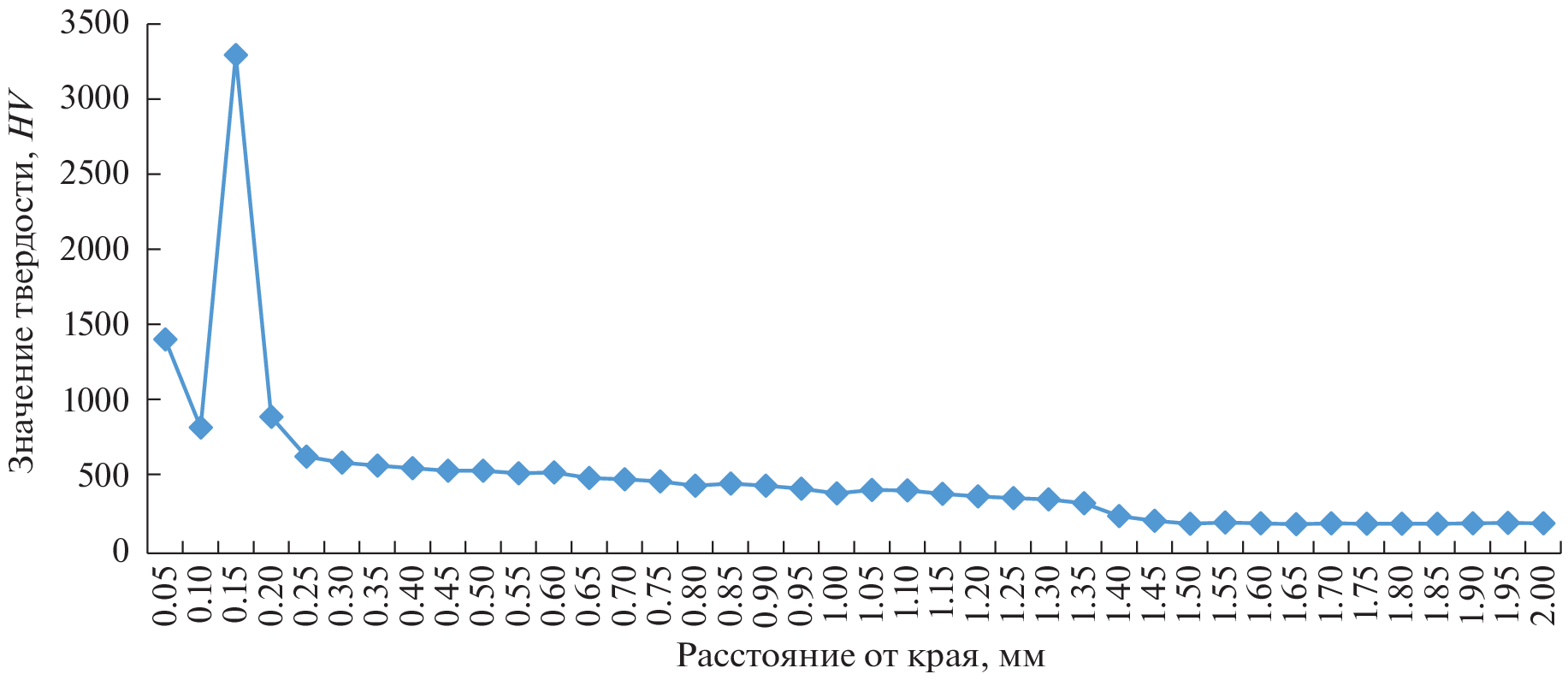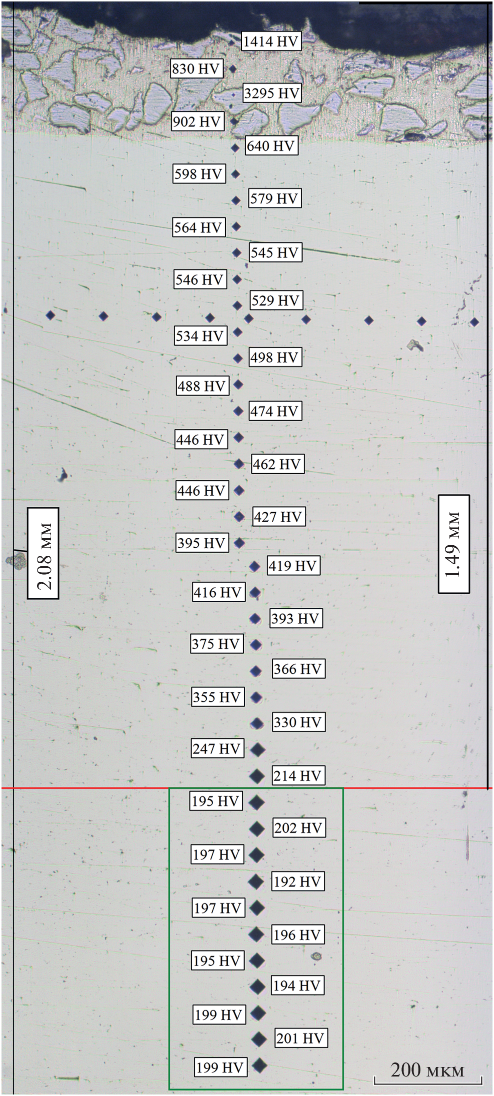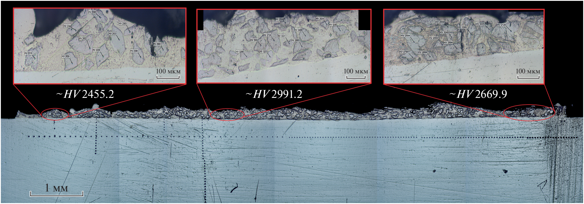 We studied the microhardness of the wear-resistant coating obtained by laser powder surfacing on the surface of 420 stainless steel. The dependences between the treatment mode, the obtained hardness and the geometry of the coating are established. It is determined that when a total equal voltage is applied to all diodes, the generated radiation does not provide uniform penetration of the substrate, and as a result, the formation of a uniform coating, both from the point of view of geometry and from the point of view of overall surface hardness. The hardness values of both individual solid particles of tungsten carbides and the total surface of the zone of thermal influence are obtained.