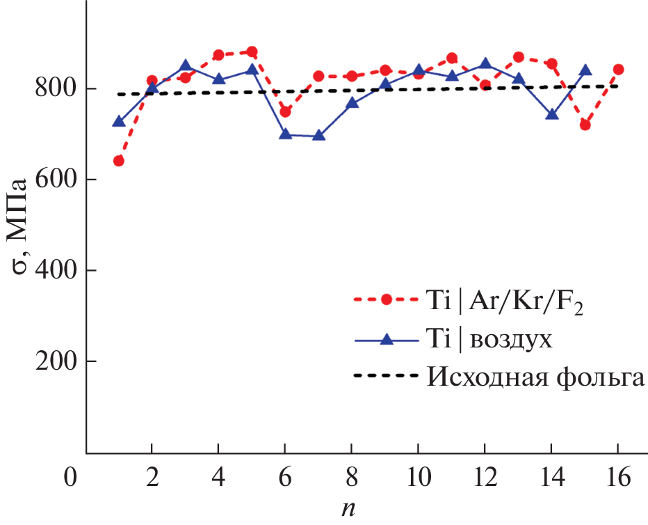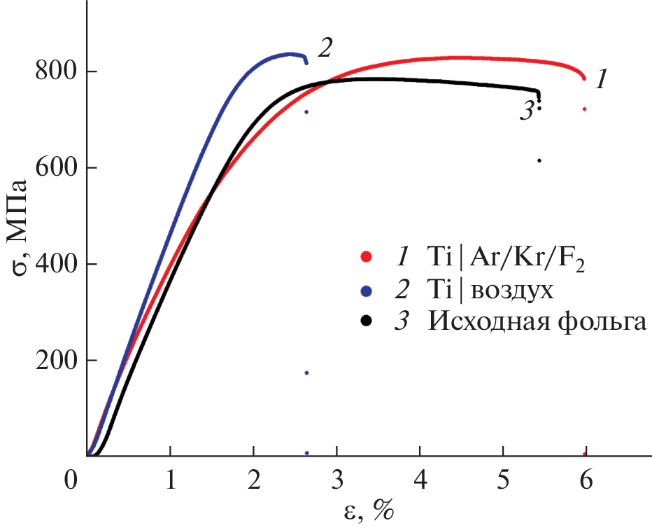 The properties of titanium foils that have been used for a long time in electron guns of e-beam-pumped excimer lasers have been studied. The tensile strength of these foils did not change when irradiated with e-beam pulses (300 keV) with doses up to 1 GGy. On the surface of Ti foils in contact with a fluorine-containing gas mixture during irradiation by e-beam, peaks corresponding to TiO2, TiN, and TiF were detected by Raman scattering.