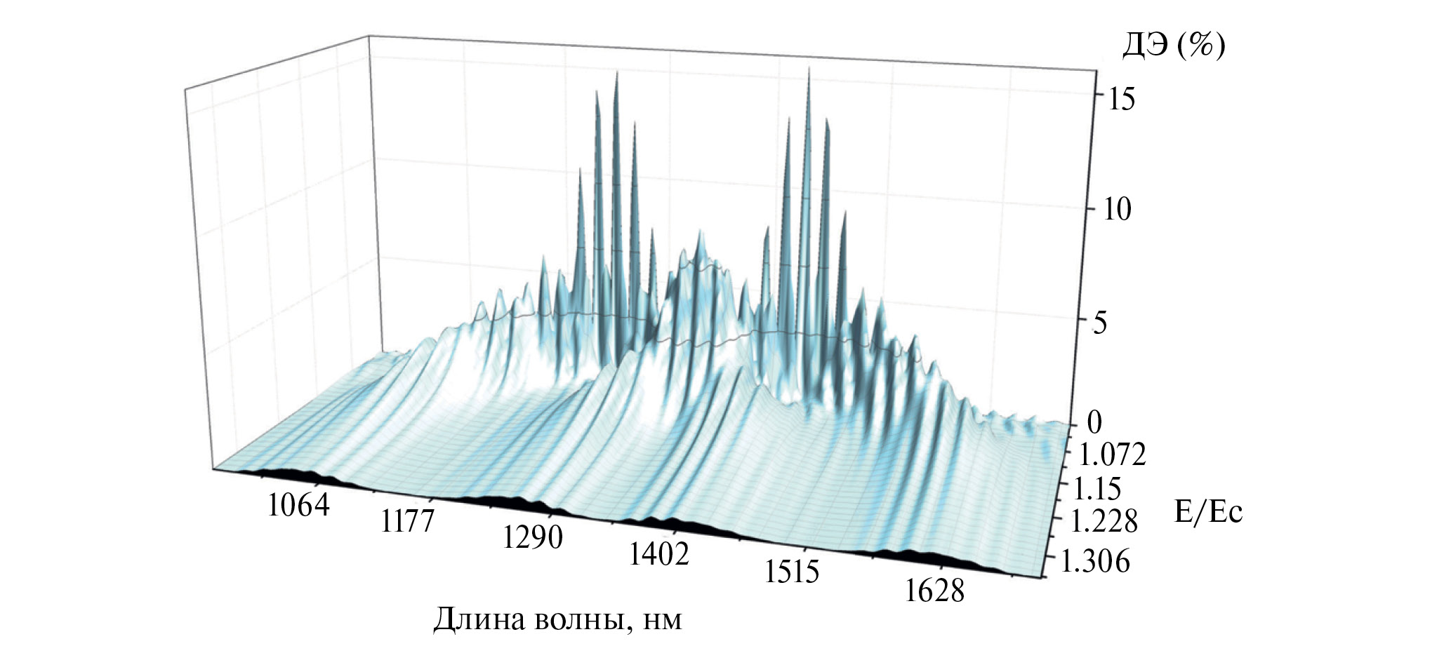 На рисунках 2 и 3 приведены зависимости ДЭ двухслойной ГДС от длины волны считывающего излучения и приложенного электрического поля на все слои с одинаковой (рис. 2) и разной полярностью (рис. 3) при считывании световой волной, поляризация которой соответствует собственным необыкновенным волнам в образце.
