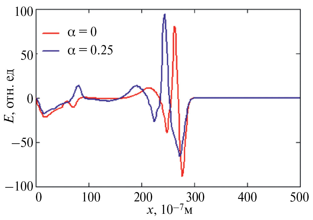 Присутствие периодической модуляции показателя преломления приводит к изменению формы и интенсивности импульса. Это происходит благодаря интерференции встречных волн, которые испытывают частичное “отражение”. Наличие интерференции также оказывает влияние на групповую скорость волнового пакета импульса, уменьшая ее, что продемонстрировано на рис. 1 [11].