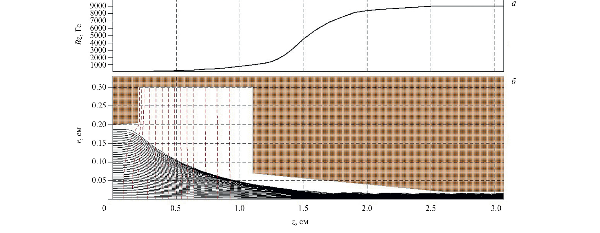 На рис. 1 представлены продольное распределение осевого магнитного поля (а), конструкция электронной пушки, эквипотенциали и траектории электронов при начальном нулевом угловом разбросе электронов, эмитированных с катодно-сеточного узла. Катодно-сеточный узел частично экранирован от фокусирующего магнитного поля. Величина индукции продольной компоненты магнитного поля на поверхности второй сетки равна 6.5 мТл. При данных параметрах обеспечивается формирование электронного пучка с максимальным радиусом 170 мкм и его 100% токопрохождение через канал транспортировки прибора.