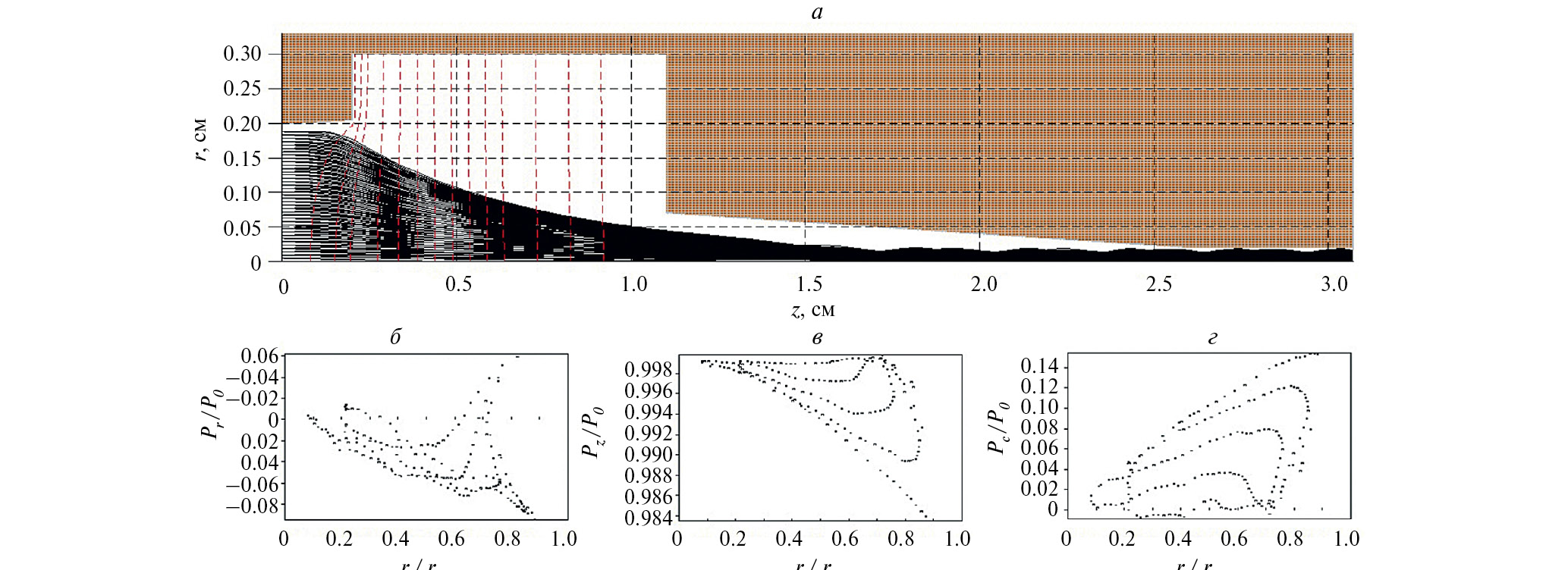 Данная конструкция была исследована на устойчивость фокусировки к угловому разбросу эмитированных с катодно-сеточного узла электронов. При этом предполагалось, что угловое распределение является однородным, что соответствует результатам, полученным в работе [6]. В результате исследований было установлено, что конструкция позволяет обеспечить 100% токопрохождение в приборе при условии, что начальный угловой разброс эмитированных электронов не превышает 2°. Большой коэффициент компрессии в данной конструкции приводит к сильному влиянию аберрации со стороны электродов электронной пушки и снижает стабильность фокусировки. На рис. 2а приведены результаты расчета траекторий электронов пучка для случая углового разброса эмитированных электронов 2°. Максимальный радиус сформированного электронного пучка составляет 190 мкм. Также на рис. 2 представлены распределения радиальной (б), продольной (в), и угловой (г) компонент импульсов электронов в выходном сечении электронной пушки. Величина поперечного эмиттанса пучка, характеризующего его фазовый объем, в этом сечении составляет 40 мрад‧мм.