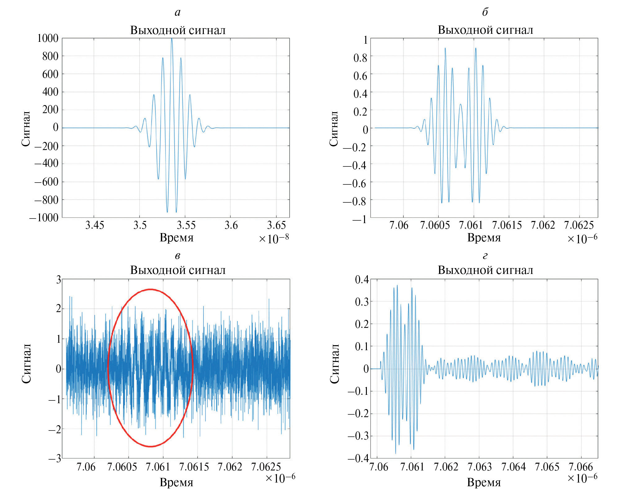Рис. 1. Характерный вид сигналов (амплитуда в относительных единицах, время в секундах) на выходах излучателя, приемника и системы обработки для двух близко расположенных целей: выходной сигнал излучателя (а), выходной сигнал приемника в отсутствие шума (б), выходной сигнал приемника с шумом (область сигнала выделена эллипсом) (в), сигнал на выходе корреляционной системы обработки (г).