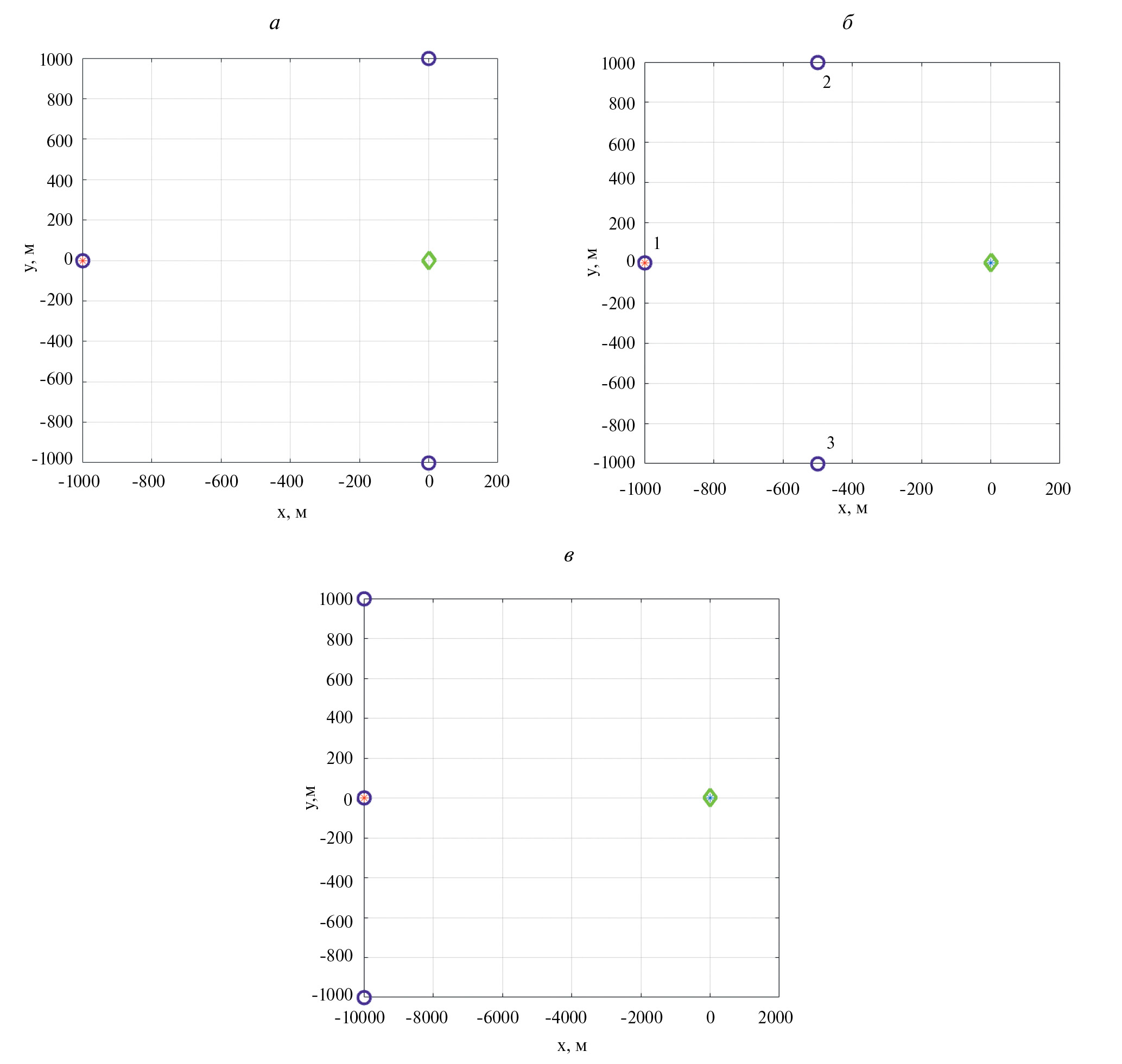 Были исследованы три варианта размещения приемных станций – два с близкой целью, когда расстояния между излучателем и приемниками сравнимы с расстоянием до цели (1 км, рис. 2а, б), и один с относительно удаленной целью, когда расстояние до цели (в данном случае 10 км) значительно (как минимум, на порядок) больше, чем расстояния между излучателем и приемниками (1 км, рис. 2в). Расположение приемников было симметричным относительно оси х, излучатель также располагался на оси х, цель находилась вблизи начала координат.