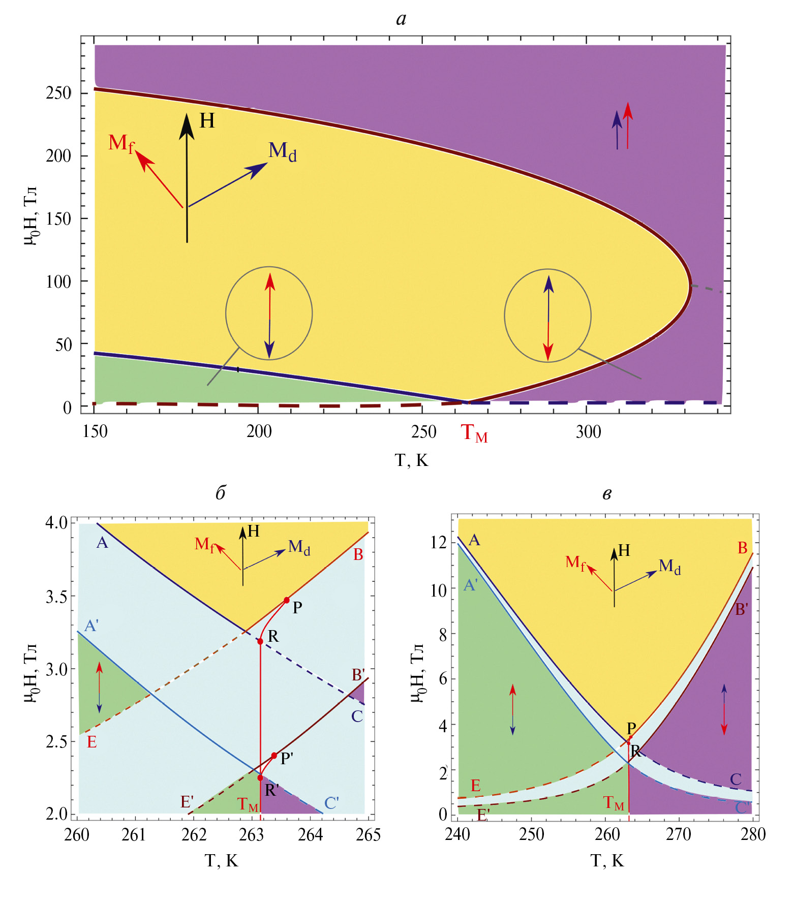 Для начала обсудим случай (а), когда внешнее магнитное поле параллельно легкой оси ферримагнетика. На рис. 1a изображена фазовая диаграмма в широком диапазоне магнитных полей. Штриховыми линиями обозначается фазовый переход второго рода между двумя коллинеарными фазами. На рис. 1б и 1в демонстрируется область фазовой диаграммы вблизи температуры компенсации намагниченности. Линии AC и BE являются линиями потери устойчивости коллинеарных фаз в отсутствие поверхностных эффектов (). Обратим внимание, что сплошные линии обозначают фазовый переход второго года между коллинеарной и угловой фазами. Штриховые линии указывают на фазовый переход между двумя коллинеарными фазами, причем область под штриховой линей отвечает области сосуществования двух коллинеарных фаз. Выделенная зеленым цветом линия на рис. 1а демонстрирует ситуацию, когда . При пересечении данной линии наиболее выгодным становится ферромагнитное упорядочивание подрешеток. При включении поверхностных эффектов эффективная анизотропия изменяется, как следует из (7), и линии AC и BE превращаются в A'C' и B'E'. На рис. 1б и 1в синий цвет указывает на разницу между двумя случаями, описанными выше. С увеличением величины магнитного поля линии AC, BE и A'C', B'E' быстро приближаются друг к другу, переходя друг в друга. Прямая на рис. 1б показывает линию фазового перехода первого рода между коллинеарными фазами, где Линия RP является линией фазового перехода первого рода между угловой и коллинеарной фазами θ = 0. Символом P обозначается трикритическая точка ферримагнетика. Обращаем внимание, что данная точка расположена справа от точки компенсации намагниченности TM из-за влияния анизотропии редкоземельной подрешетки. Линия RP преобразуется в R'P' из-за наведенной поверхностной анизотропии и, как следствие, область фазового перехода первого рода между коллинеарной и угловой фазами существенно сокращается, а трикритическая точка стремится к линии фазового перехода первого рода между коллинеарными фазами. Таким образом, рис. 1б и 1в показывают, что анизотропия поверхности играет значительную роль вблизи магнитного поля, – критическое поле в окрестности точки компенсации намагниченности. В результате наведенные поверхностные эффекты способны перемещать трикритическую точку как в высокотемпературную, так и в низкотемпературную области. В частности, поверхностные явления позволяют наблюдать трикритическую точку слева от точки компенсации при учете влияния поверхностных обменных взаимодействий, что продемонстрировано в работе [15]. Однако, учитывая возможную связь параметров анизотропии и констант поверхностной анизотропии, можно сделать вывод о том, что трикритическая точка может перемещаться в низкотемпературную область фазовой диаграммы под воздействием иных поверхностных эффектов.