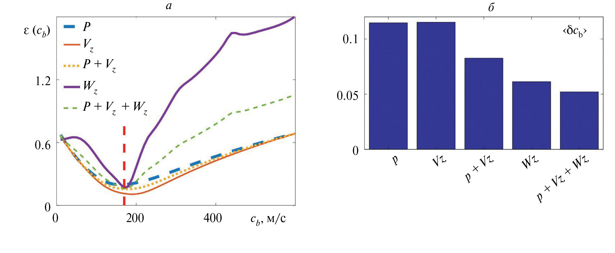 При численном моделировании использовались следующие параметры задачи, близкие к условиям эксперимента [5, 8]: H = 8 м, zs = 0.3 м (приповерхностный источник), zr = 7.5 м (приемный модуль располагается вблизи дна), ρb= 1700 кг/м3, ρ0 = 1000 кг/м3, c0 = 1500 м/с. Расстояние между источником и приемником к изменялось от 26 м до 52 м с шагом 0.5 м (r0 = 26 м). Вычислялись уровни L(r) для давления P и вертикальных компонент Vz, Wz – LP(r), , LW(r) соответственно. При восстановлении использовались исходные данные отдельно в виде LP(r), и LW(r). Дополнительно рассматривался одновременный учет пространственных затуханий LP(r) и (в этом случае суммарная невязка вычислялась как среднеарифметическое невязок εр и , полученных отдельно для LP(r) и соответственно: ), а также объединенная оценка для всех трех функций LP(r), , LW(r) (в этом случае итоговая невязка ). Для анализа помехоустойчивости получаемых оценок cb к модельным данным и независимо на разных частотах f и дальностях r добавлялась нормально распределенная случайная шумовая помеха с нулевым средним и среднеквадратичным амплитудным отклонением, составляющим 30% от значений и . В реальной ситуации отношение сигнал/помеха зависит от дальности и частотного диапазона, шумы могут быть коррелированными, то есть рассматриваемая модель шумов весьма упрощенная. Детальное рассмотрение возможных моделей шумов выходит за рамки настоящей работы. Примеры расчетов зависмостей при использовании различных комбинаций исходных данных представлены на рис. 1а. Как видно на рис. 1а, невязка имеет минимум вблизи истинного значения cb = 170 м/с. Однако оценка скорости , соответствующая этому минимуму, не совпадает с истинным значением cb, причем величина этого отличия разная при использовании различных исходных данных. Наиболее точные результаты удается получить при совместном использовании информации о пространственном затухании P, Vz, Wz. Были последовательно произведены вычисления невязок для 500 различных реализаций шума при постоянном его уровне в 30%. Усредненные по множеству реализаций шума значения невязок представлены на рис. 1б. Как видно на рис. 1б, минимальное значение достигается при совместном использовании информации о пространственном затухании P, Vz, Wz. При этом пространственное затухание только давления P дает ошибку оценки скорости, более чем в два раза превышающую аналогичное значение, полученное при совместном рассмотрении P, Vz, Wz. Второе по возрастанию значение ошибки дает способ расчета невязки с использованием вертикальной компоненты потока акустической мощности Wz. Следует отметить, что зависимость , полученная для Wz, имеет большие градиенты близи минимума (рис. 1а), по сравнению с одновременным использованием P, Vz, Wz, когда минимум невязки оказывается более пологим. Это является преимуществом при поиске глобального минимума многомерной невязки методами типа градиентного спуска по зашумленным данным. В следующем разделе при обращении экспериментальных данных будет использоваться информация о пространственном затухании Wz.