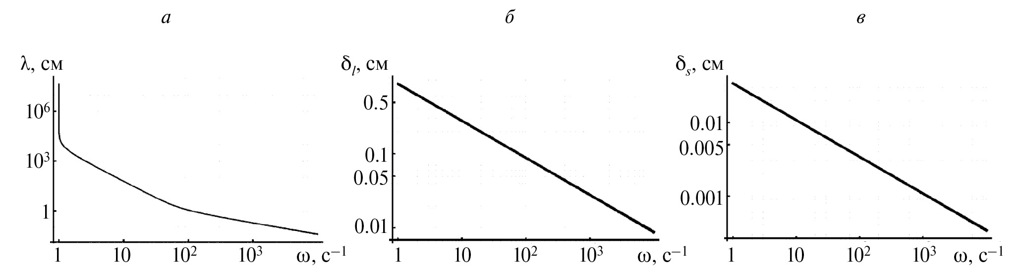 Построим зависимости (26)–(28) от частоты периодического движения для жидкости с параметрами воды ρ00 = 1 г·см–3, g = 981 см·с–2, σ = 72 эрг·см–2, ν = 0.01 см2·c–1 с растворенной в ней NaCl с концентрацией n = 5 моль·л–1. Коэффициент диффузии при этом примет значение kS = 1.49·10–5 см2·с [19]. При построении всех графиков будем считать, что частота плавучести принимает значение N = 1 с–1. На рис. 1 представлены зависимости линейных масштабов компонентов течения от частоты периодического движения.