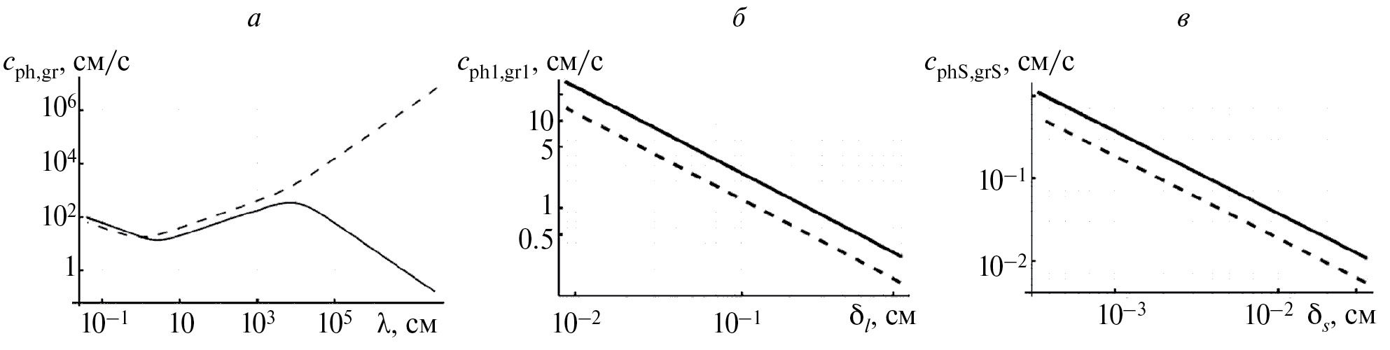 Рис. 3. Зависимость фазовой (пунктирные линии) и групповой (сплошные линии) скорости от (а) длины волны, (б) лигамента поля скоростей, (в) лигамента солености.