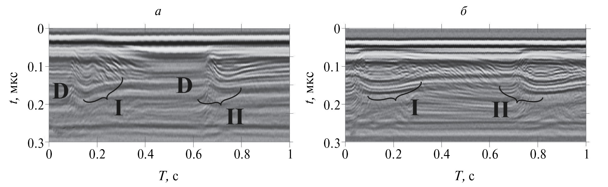Рис. 3. Фрагменты М-сканов, измеренные в моменты Те = 41 мин (а) и Те. = 71 мин (б).