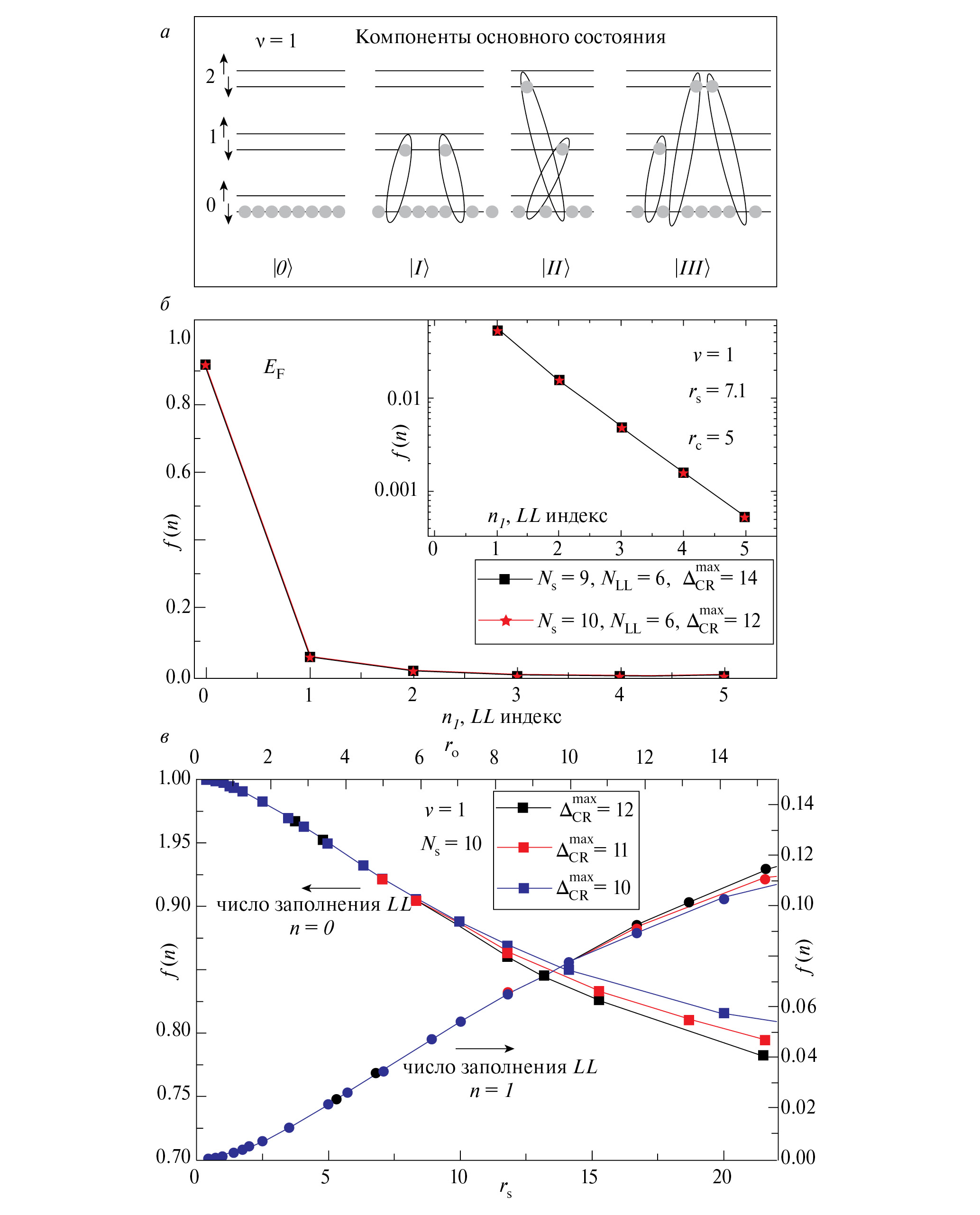 Извлеченные из процедуры ТД комплексные амплитуды всех многочастичных конфигураций в структуре основного состояния были использованы для подсчета чисел заполнения УЛ f(n), n = 0,1,2,… На рис. 1б показан расчет функции распределения электронов по УЛ при ν = 1, rs = 7.1 и параметрах дискретного счета NS = 9, NLL = 6, = 14 и NS=10, NLL = 6, = 12 (численность урезанного базиса, достаточного для сходимости расчета, составляет около 2 млн векторов при размерности полного базиса ~750 млн). При анализе в логарифмической шкале (вставка на рис. 1б) получено, что характер угасания f(n) при n ≥ 1 близок к экспоненциальному. На рис. 1в приведена расчетная зависимость заселенности УЛ с индексами n = 0 и n = 1 при росте параметра rs. Разность между значениями f(n = 0) и f(n = 1), в сущности, является аналогом скачка Мигдала для функции распределения электронов в квантующем магнитном поле. В квантующем магнитном поле величина скачка отклоняется от единицы квадратично по rs, что качественно отличается от случая ферми-жидкости в нулевом магнитном поле.