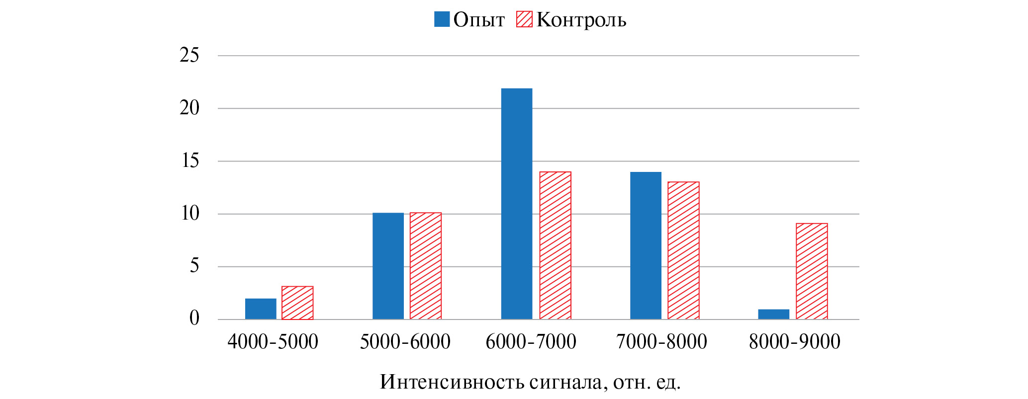 Рис. 7. Распределение интенсивности SERS опыта и контроля при определении IgGHum (24 нг/мл) с использованием раствора аптамеров к BoNT с концентрацией 17.5 нМ на подложке