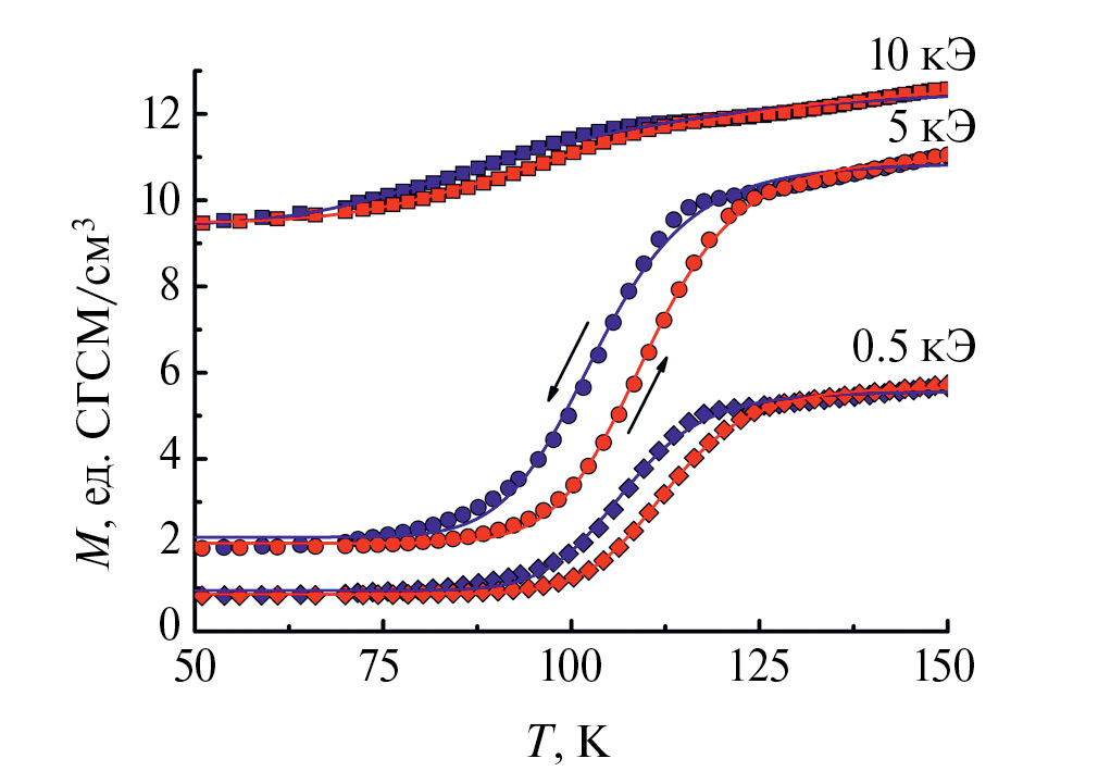На рис. 3 представлены фрагменты температурных зависимостей намагниченности наночастиц ε-In0.04Fe1.96O3 в окрестности температурного гистерезиса, измеренные в различных магнитных полях. Сплошными линиями показана аппроксимация с помощью выражения (5). Из аппроксимации были определены значения намагниченностей MLT и MHT, энтальпии и энтропии, а также другие термодинамические характеристики обсуждаемого спин-переориентационного перехода, регистрируемого в различных магнитных полях (табл. 1).