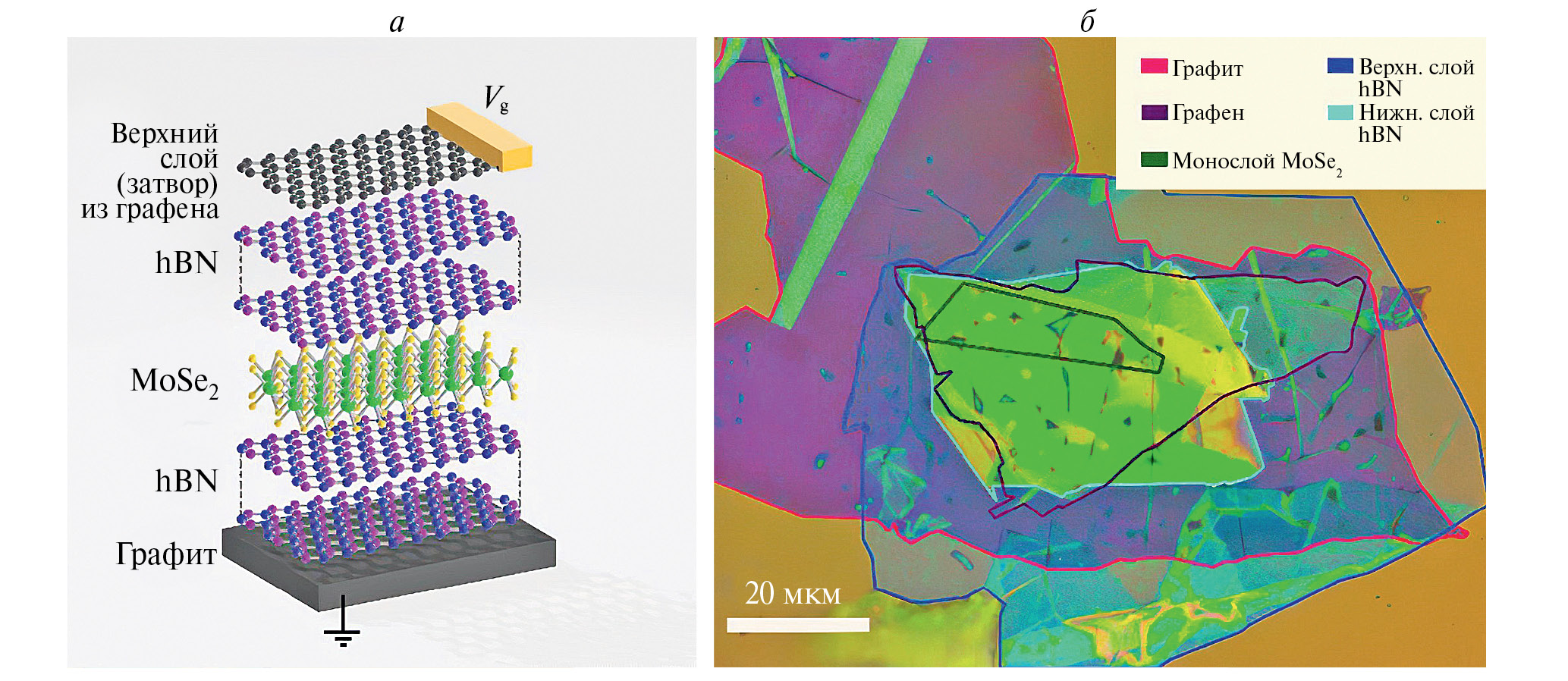 Рис. 1. Cхема структуры с контактами для приложения вертикального электрического поля (а). Фотография образца с контурами составляющих его слоев, которые выделены цветовыми линиями (толщины слоев: графит 3 нм, нижний слой hBN100 нм, монослой MoSe2 0.3 нм, верхний hBN10 нм, многослойный графен 1 нм) до напыления контактов (б)