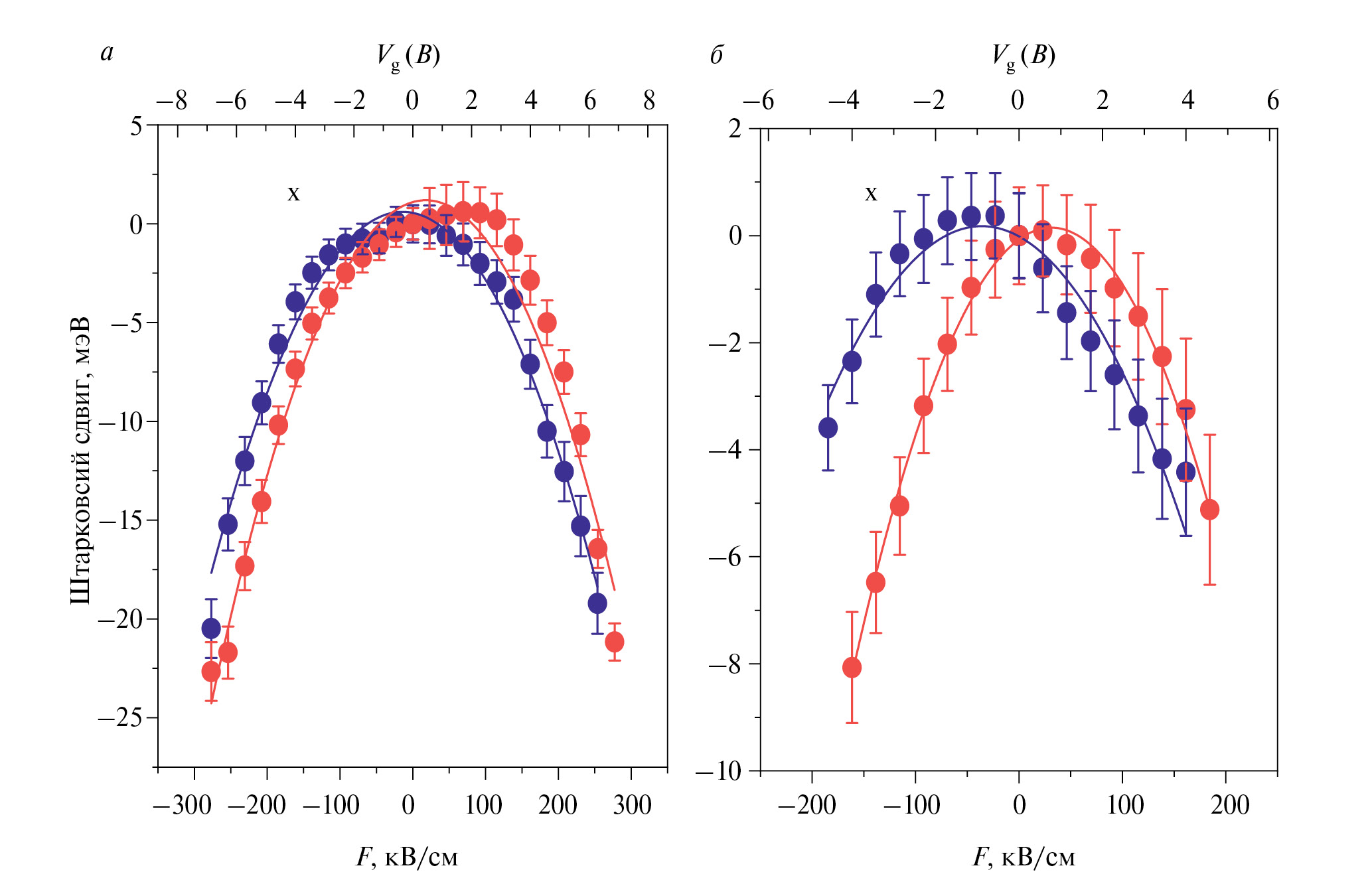 На рис. 4 представлены штарковские сдвиги линий ФЛ экситона для двух точек образца. На рис. 4а показана зависимость для случая, когда в спектре наблюдается только линия экситона, и на рис. 4б – для случая, когда в спектре присутствует линия триона.