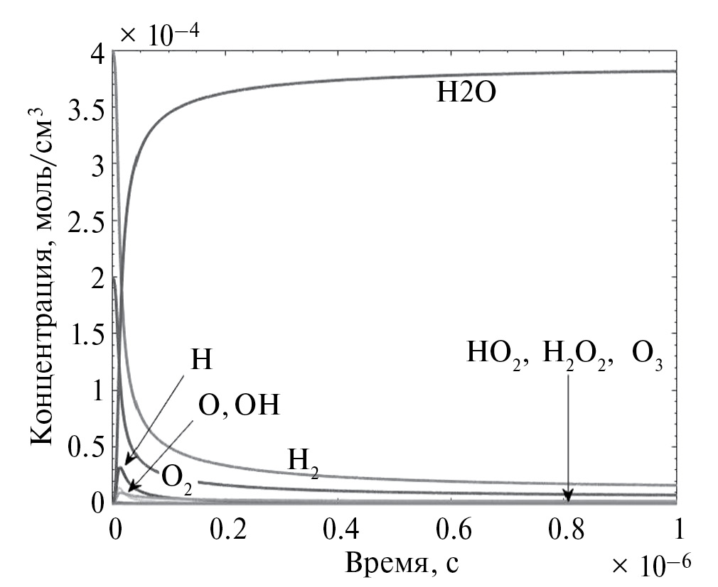 На рис. 3 показана зависимость важнейших компонент от времени при указанных условиях. Начальные концентрации соответствуют «гремучей смеси»: 2 части H2 на 1 часть O2. Расчеты проводились с использованием пакета GACK [19] с автоматическим формированием правых частей и контролем фактической точности в ходе расчета. Видно, что концентрации исходных компонент монотонно убывают. Конечным продуктом является вода, концентрация которой возрастает. Математическая точность расчета была не хуже 1%.
