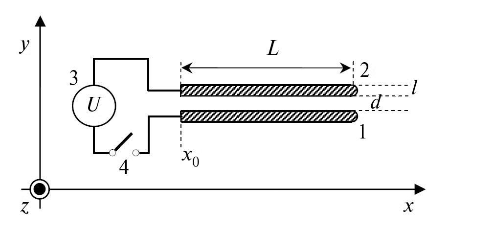 Рассмотрим следующую задачу (рис. 1). Пусть двумерная область G свободного пространства содержит воздушную линию, состоящую из двух идеально проводящих полосок 1, 2, расположенных параллельно друг другу. Они имеют одинаковую длину L. Расстояние между ними равно d. Толщина каждой полоски l удовлетворяет условию l > d. Радиус скругления правого края полосок равен l / 2. К левым краям полосок через ключ 4 подключается источник постоянного напряжения 3. Скорость срабатывания ключа будет определять изменение во времени электрического напряжения U(t) между полосками в точках подключения источника x0. Без ограничения общности положим, что