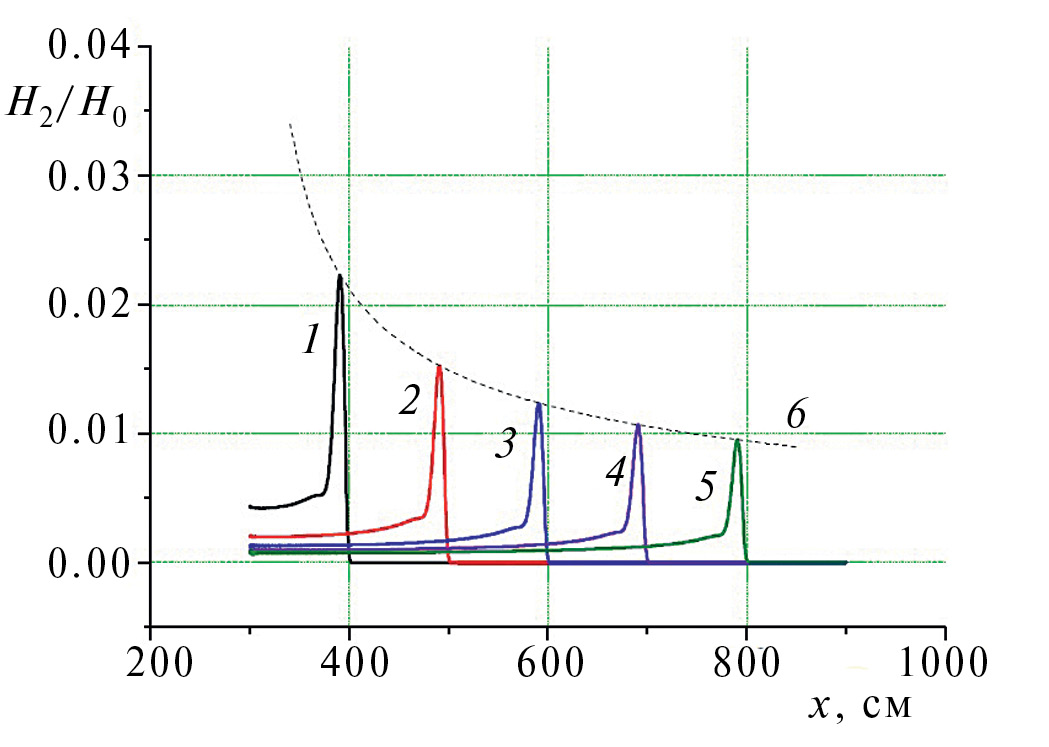 На рис. 2 приведены зависимости Hz компоненты от продольной координаты на прямой y = 300 см в различные моменты времени. Указанный отрезок прямой параллелен оси x, начинается при x = L и расположен посередине между идеально проводящими полосками. Кривые 1, 2, 3, 4 и 5 соответствуют моментам времени 13.3, 16.7, 20.0, 23.3 и 26.6 нс.